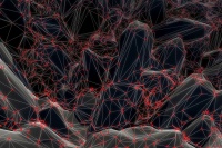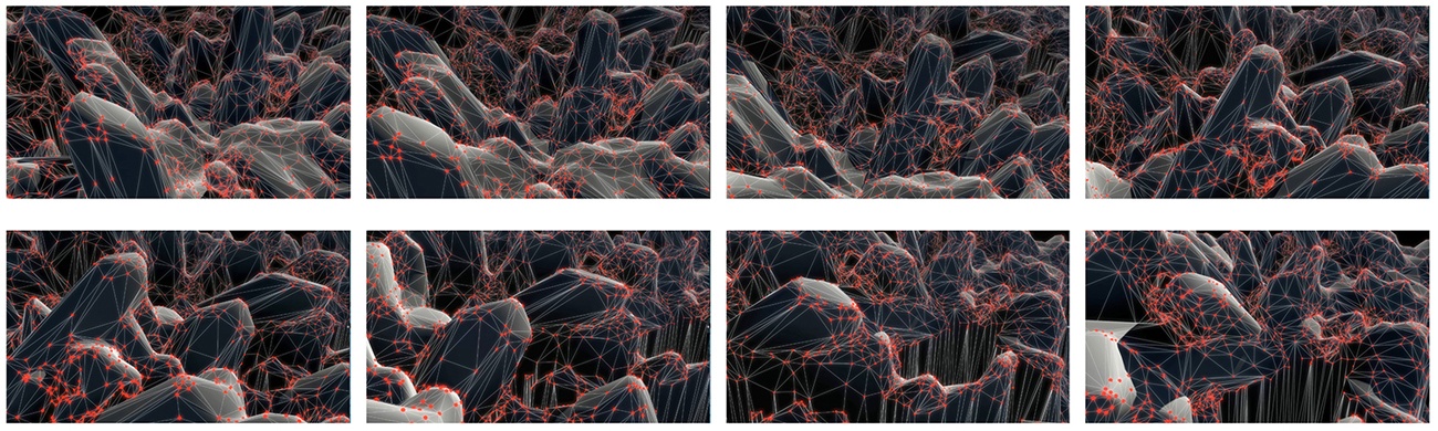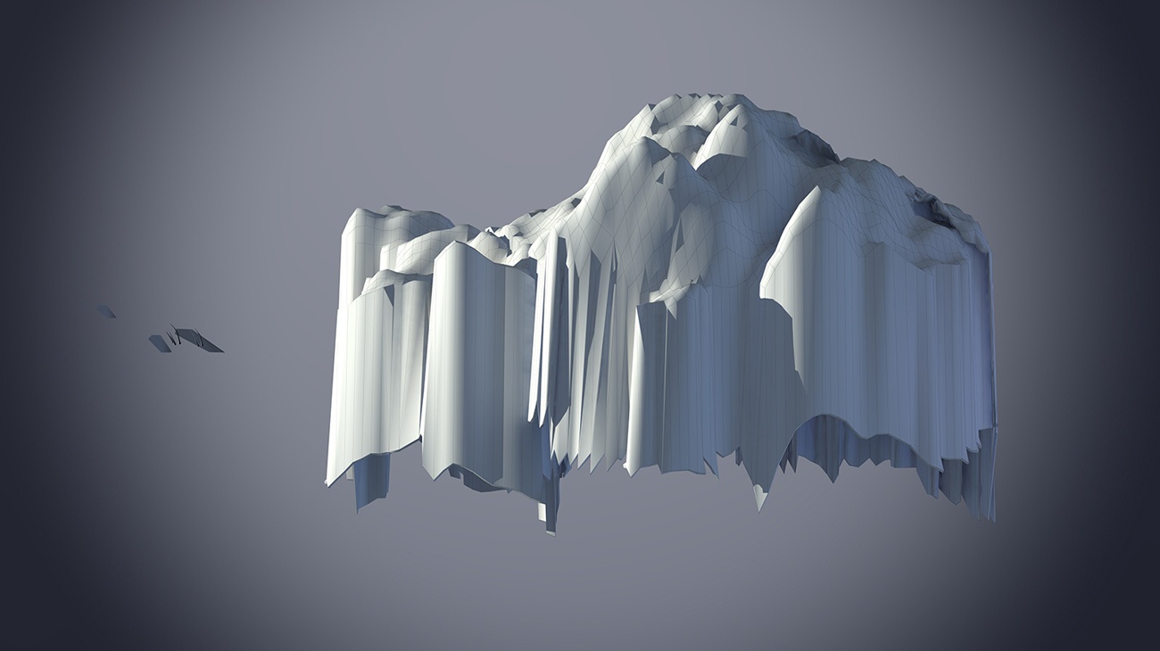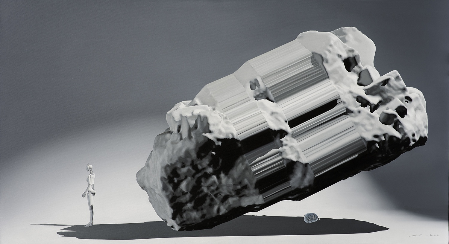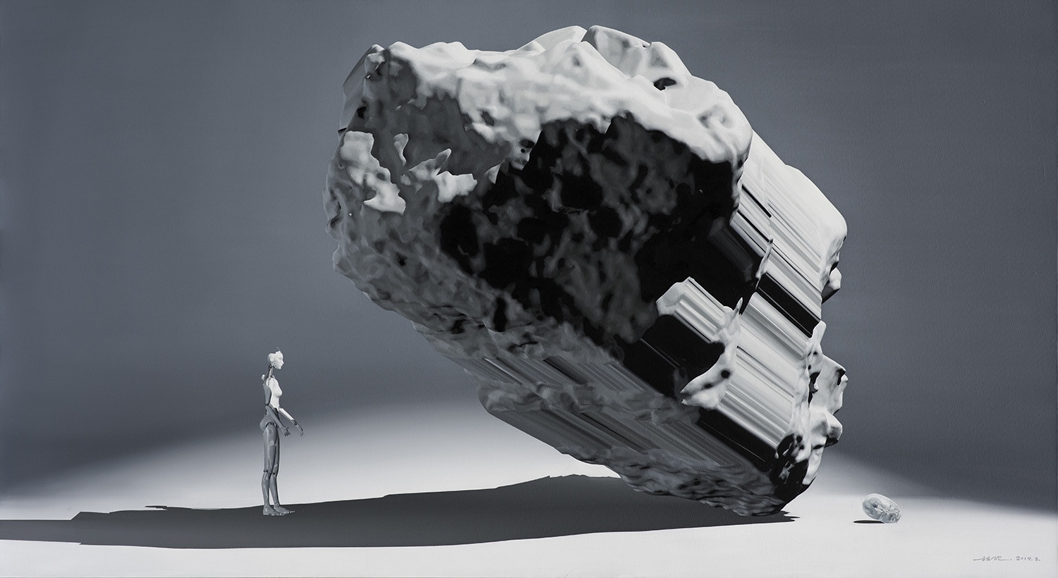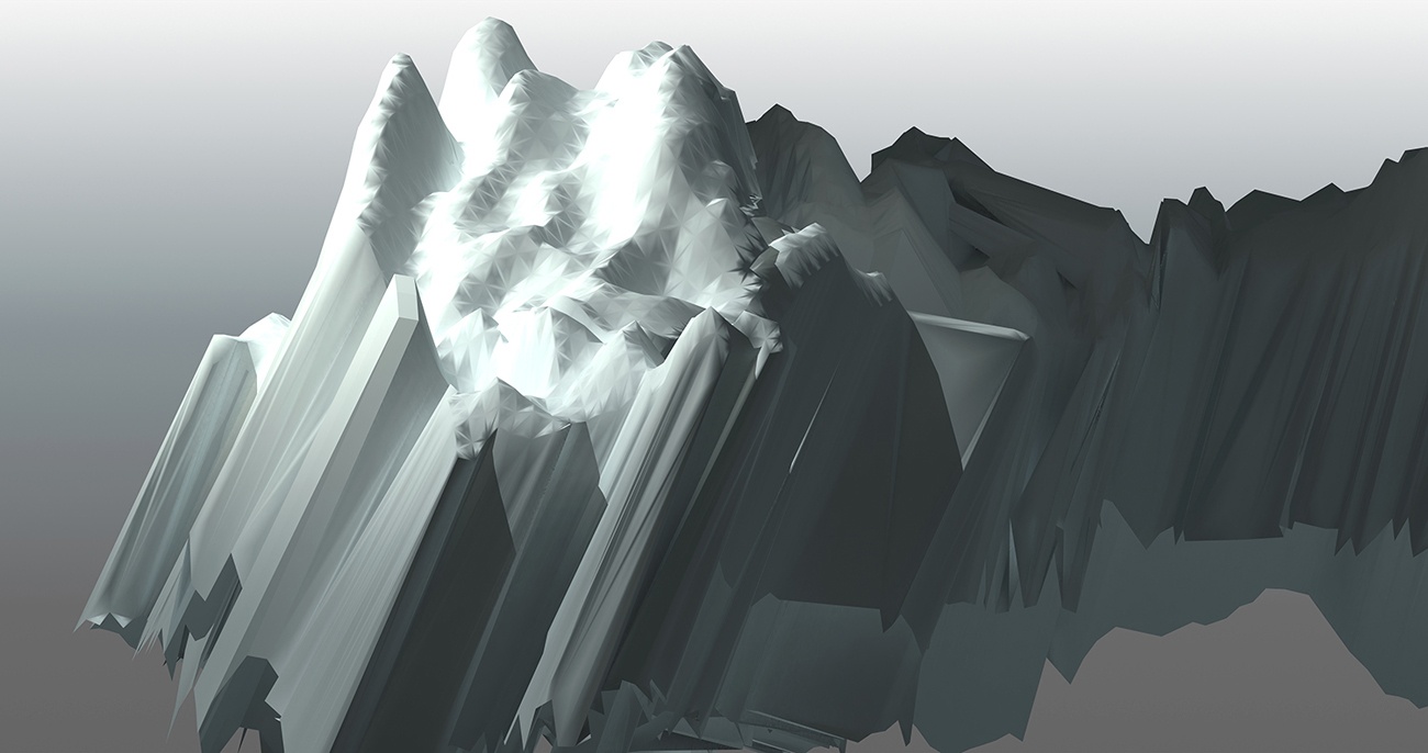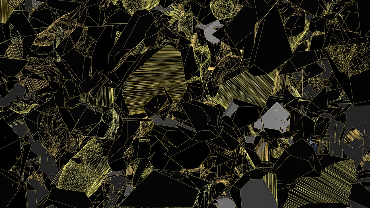 这一系列新作,如我对一块现实的石头数据进行了各种尝试和解构,用数字手段进行扫描、点线拉扯等等,保留它在虚拟状态下被修改、被破坏的过程和痕迹。通过特意保留错误的形态,去定格一个物在转变中的状态,固化一种转瞬即逝的空间形态,从而表现一种非常态的心理感受。所以这是一种刻意的保留和节选,是我在虚拟图像的汪洋里节选出来的图形样本。