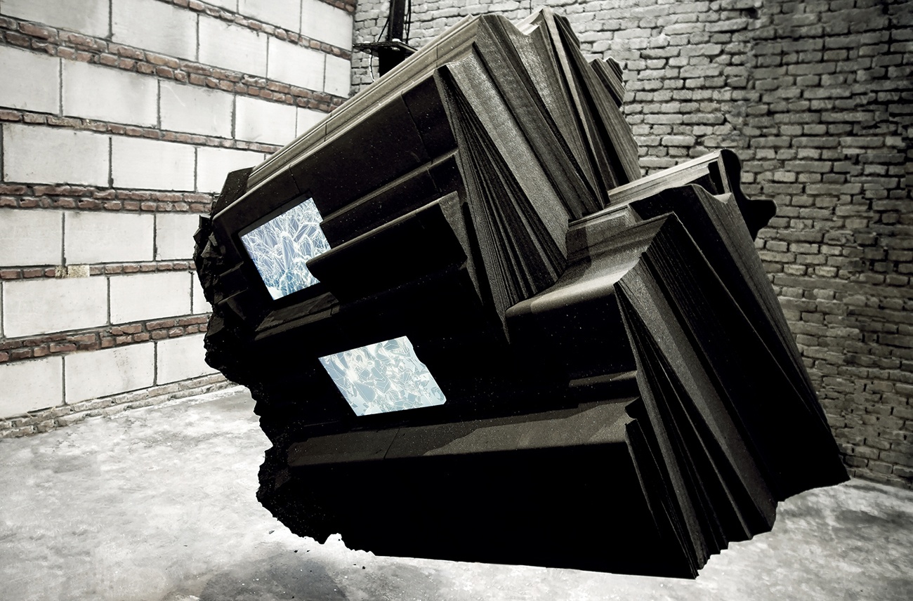 林欣的两件作品令我骤然清醒。影像装置《错误的秩序——废弃》的视觉观感、独特对比性及对于美学观的强调让我印象深刻。这件作品通过黑色海绵、电子屏构造出两个重叠的异形石状,有那么些笨重,又有那么些沉重。我一直在琢磨,这废弃的“芯”到底是类人的“芯”片,还是我们依赖高科技生活所酿造的残破的“心”?黑色、柔软、电子、镜头……这些关键词赋予这件作品以耐人寻味的指向。这颗“芯”是我们人类为了铸造更优秀的机器人而充满欲求的结果。它正在慢慢地吞噬我们的“真心”,他正在慢慢地侵蚀我们的“思考”。