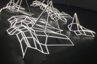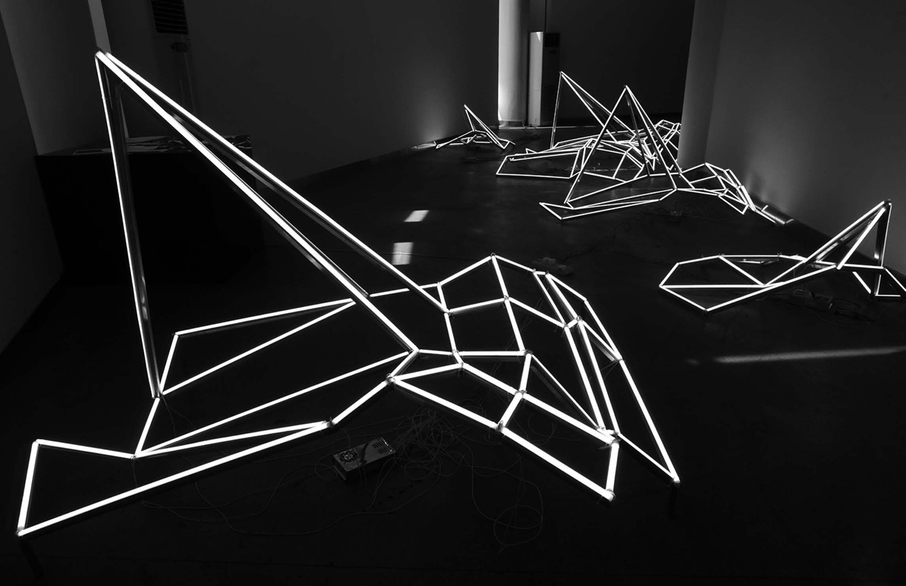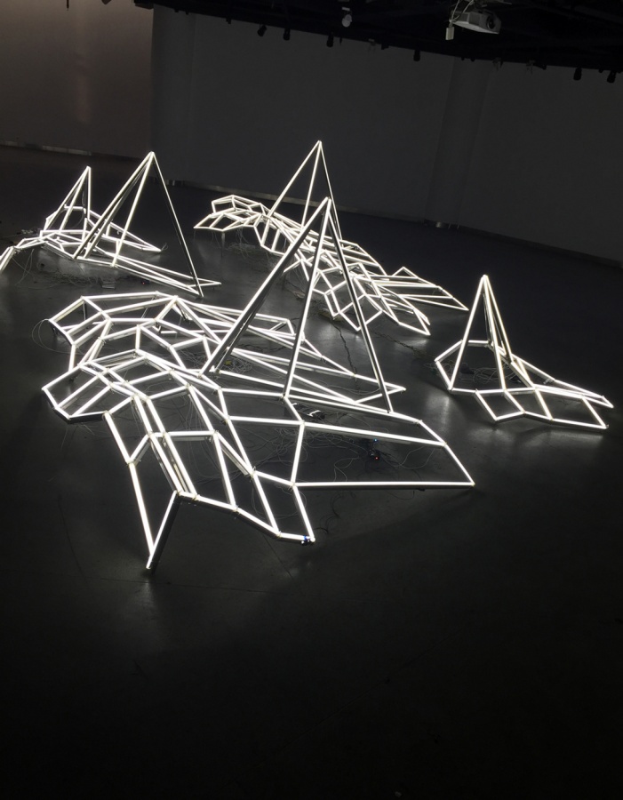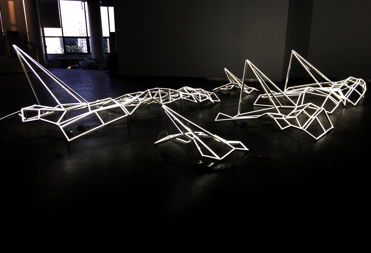 灯光雕塑《时光的额外维度》似乎有着更严厉的警告。随着距离感和历史感的消失,这些机械、碎片,究竟是我们制造的机器人被毁坏所留下的“碎片”,还是它们即将成为更强大的存在而代谢下来的“碎片”呢?这些碎片抛出了这样一个话题:是被机器人取代,还是成为比机器人更伟大的存在?