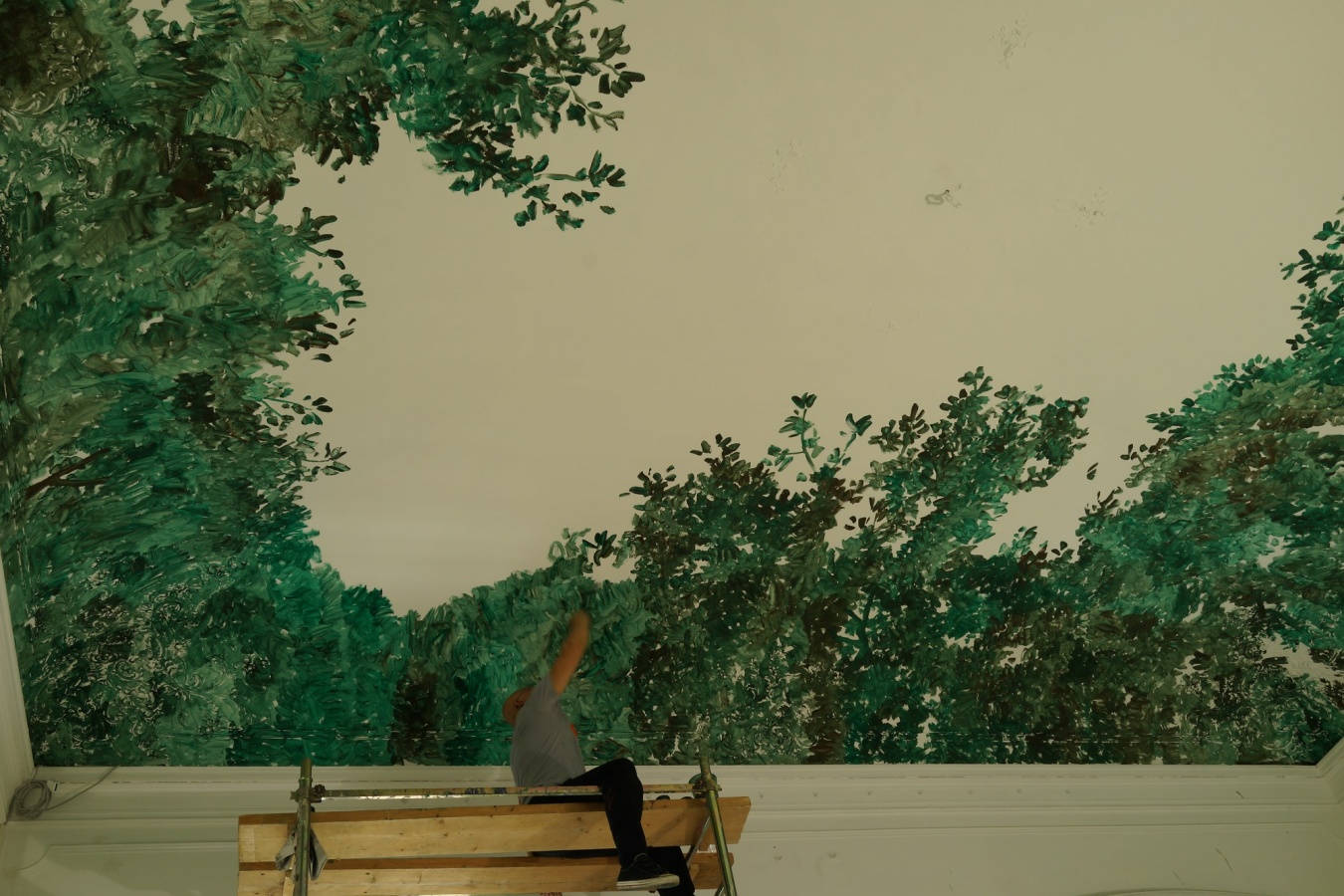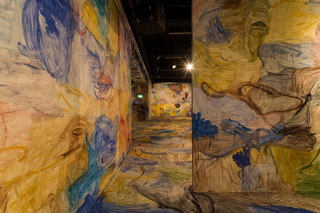 在蒲鸿的研究中,他不再关注每位艺术家实现各自风格的过程,转而诘问时下将绘画作为“用笔刷将颜料涂抹在画布上的单一性动作”的传统观念。以徐震/没顶公司为例,他得出结论,绘画表达的形成无需画笔,甚至无需颜料本身。徐震完全摆脱了传统的绘画材料,在画布上进行多层次不同质地的拼贴,创造了属于他自己的二维绘画图像。类似的,徐红明摒弃了画笔,直接用手或筛子将颜料播撒在潮湿的纸面上,以获得自然的、不期而遇的元素。同样在这个展览中,张恩利虽仍将使用颜料,却彻底抛弃了画布和平面维度的限制,他将为OCAT 西安馆创作一件独一无二的空间绘画作品,贯穿于二层展厅。这一手法让观众在空间中行走、坐着甚至躺下时,都可以浸入式地体验漂浮于绘画平面之上的感受。