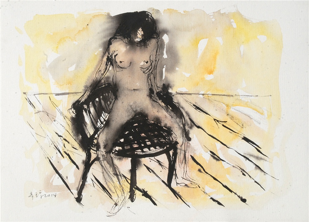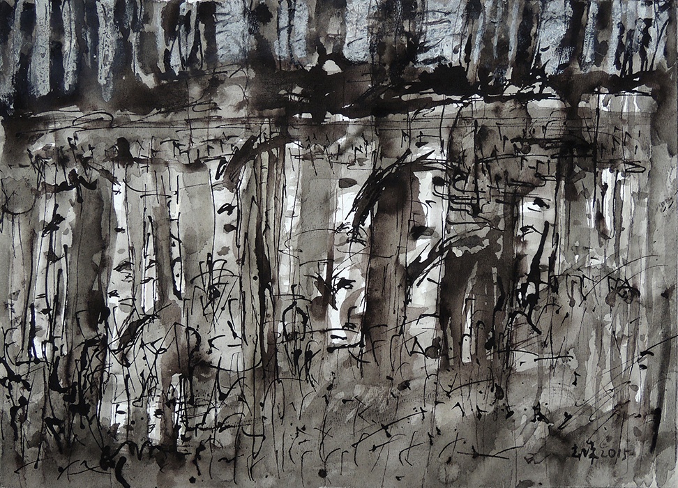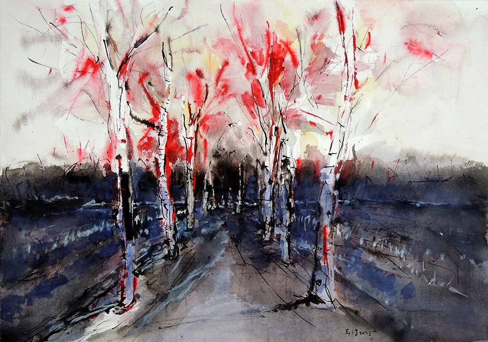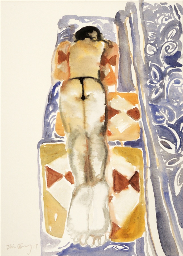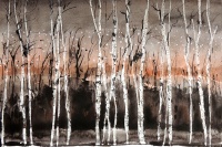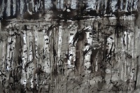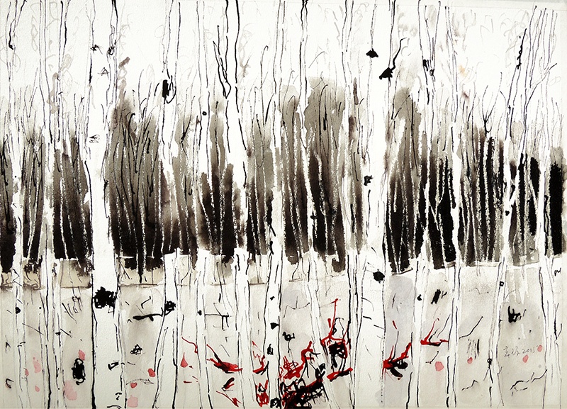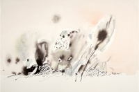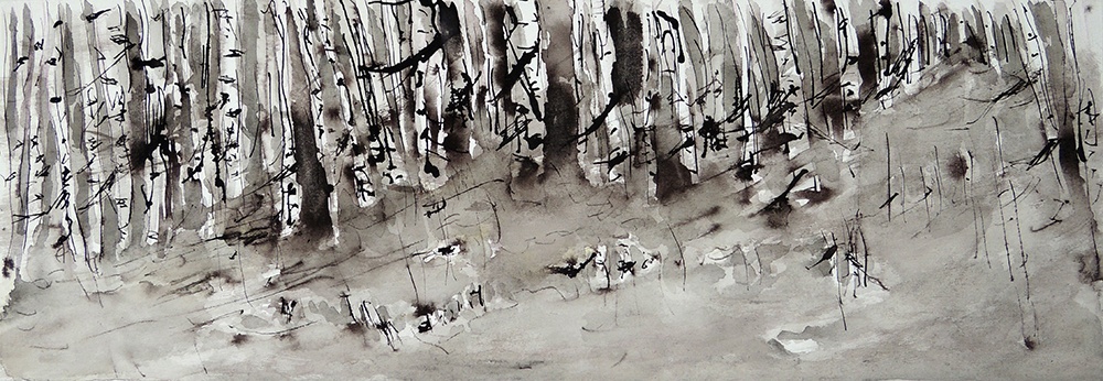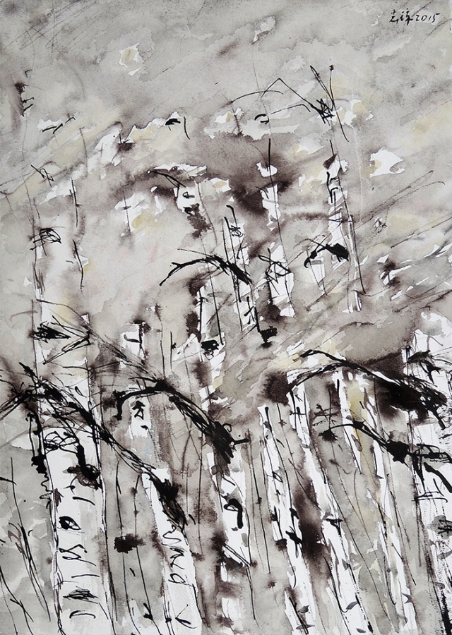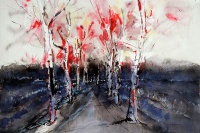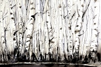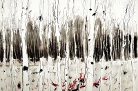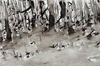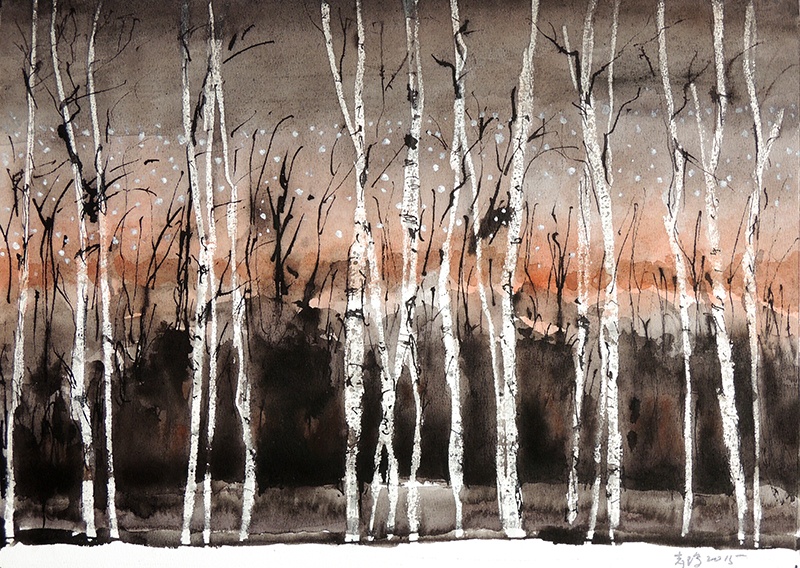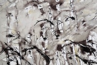 黄志琼的水彩作品,与其油画系列作品《向水中生长的树》相呼应,但更为具有线条歌咏的韵味,以白色树干与黑色线条交错书写的白桦树,宛若一只只动人的旋律。黄志琼以其回忆的余光捕获那打在树干上的瞬间光线,在树干与枝条长短不一的并排摇曳与柔韧地生长中,消逝的光线闪烁出艳丽灼热或深沉幽暗的光芒,画面回响着一曲曲忧伤而迷人的骊歌,随着线条越来轻盈流荡,牵缠我们迷离的目光,我们的目光如同枝条一般渴望去拥抱并呼吸那灿烂的阳光,艺术家让明媚的光线化身成为了树干。这些水彩作品是一颗美好心灵在自然景色中为我们重新发现了色彩与线条的秘密,让一个更为内在的自然获得了恬美的艺术形式。