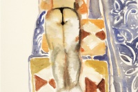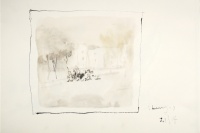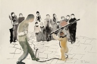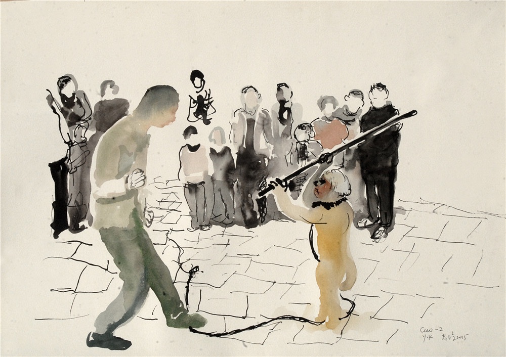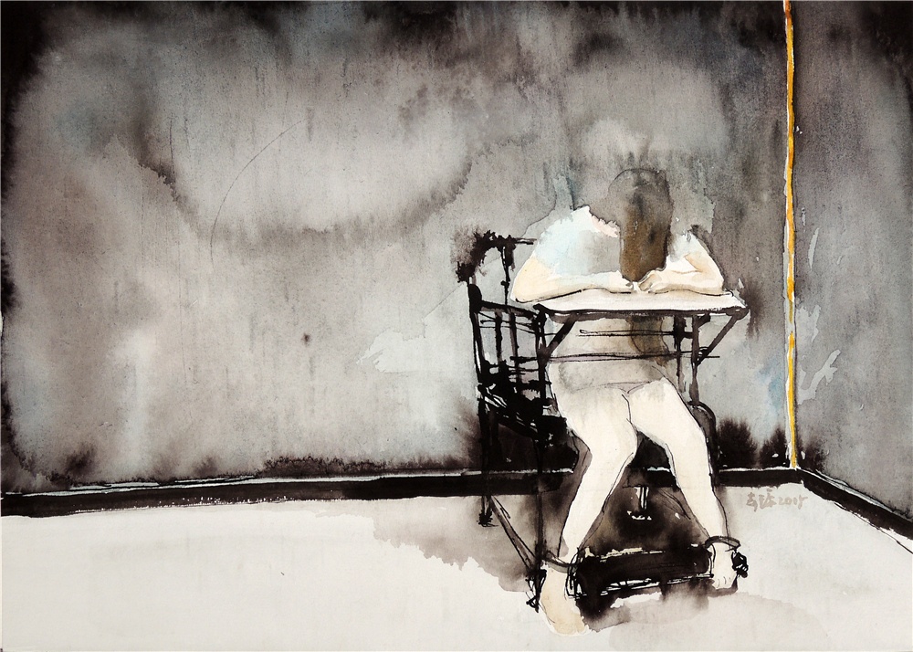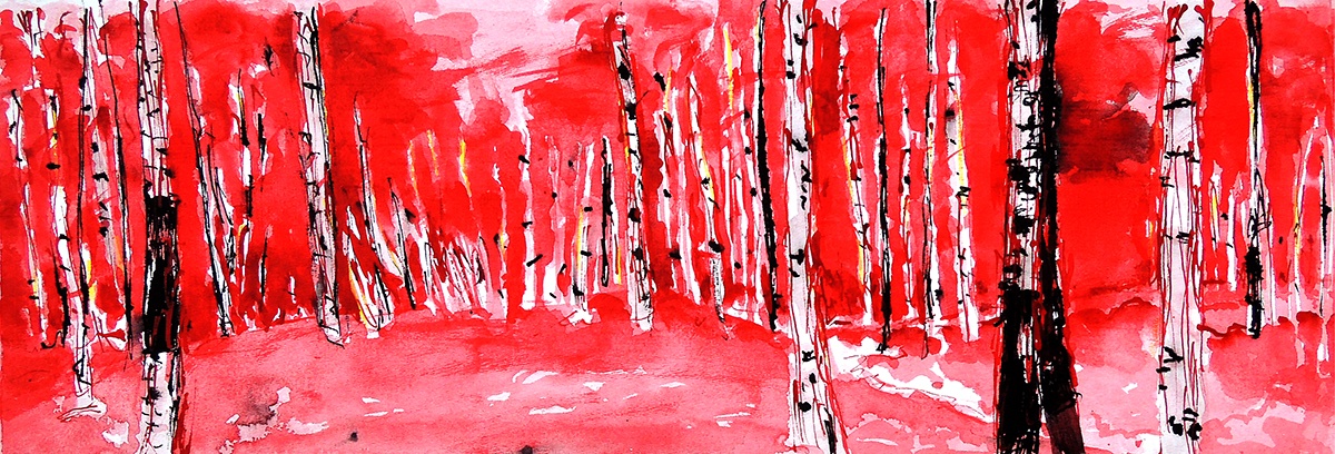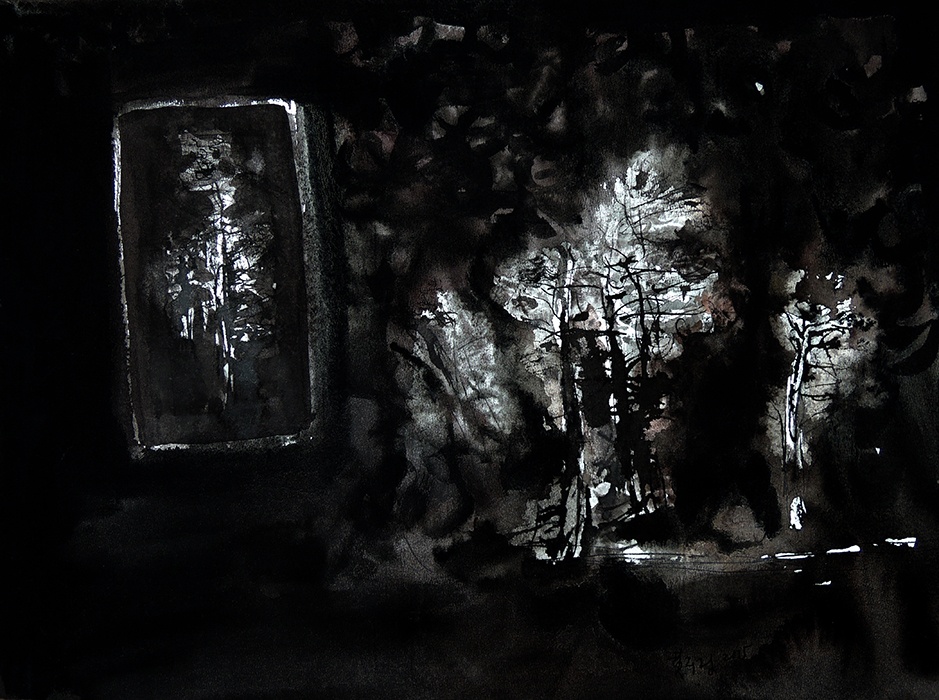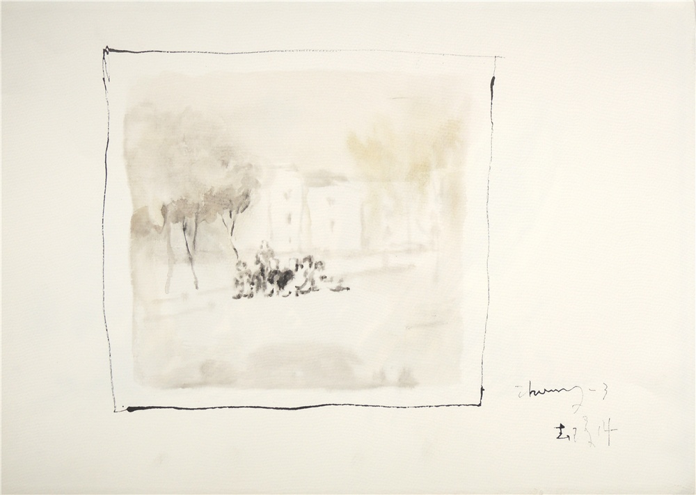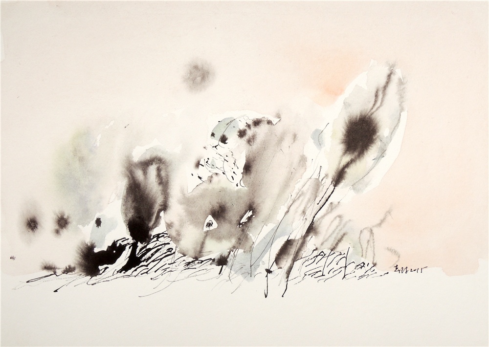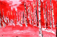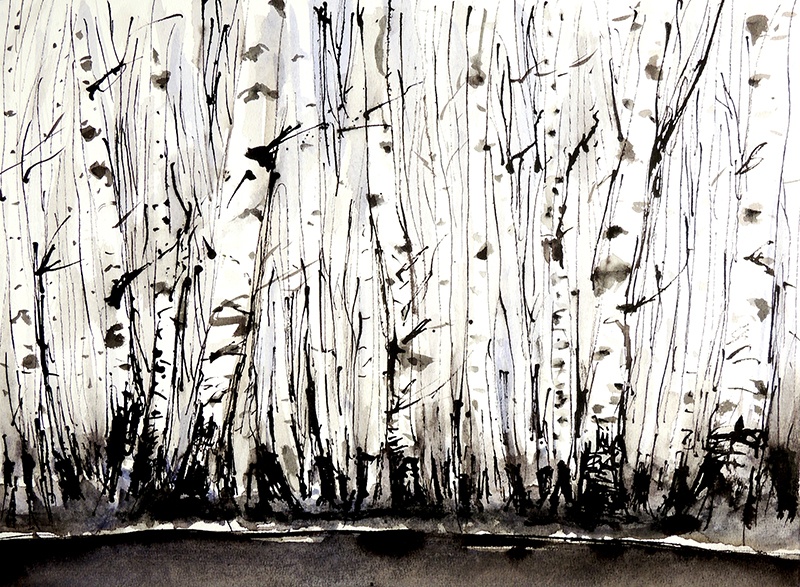 黄志琼的水彩作品,与其油画系列作品《向水中生长的树》相呼应,但更为具有线条歌咏的韵味,以白色树干与黑色线条交错书写的白桦树,宛若一只只动人的旋律。黄志琼以其回忆的余光捕获那打在树干上的瞬间光线,在树干与枝条长短不一的并排摇曳与柔韧地生长中,消逝的光线闪烁出艳丽灼热或深沉幽暗的光芒,画面回响着一曲曲忧伤而迷人的骊歌,随着线条越来轻盈流荡,牵缠我们迷离的目光,我们的目光如同枝条一般渴望去拥抱并呼吸那灿烂的阳光,艺术家让明媚的光线化身成为了树干。这些水彩作品是一颗美好心灵在自然景色中为我们重新发现了色彩与线条的秘密,让一个更为内在的自然获得了恬美的艺术形式。