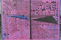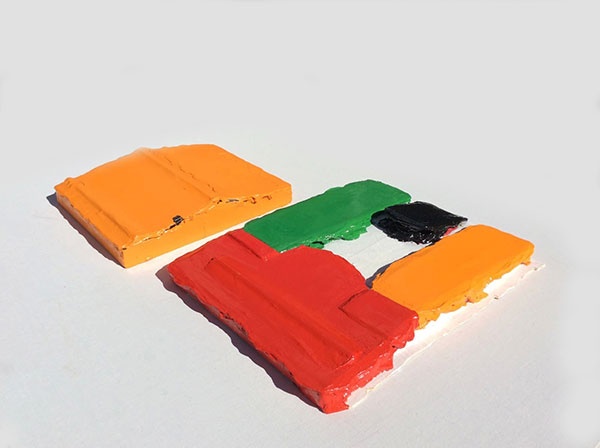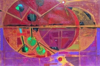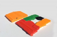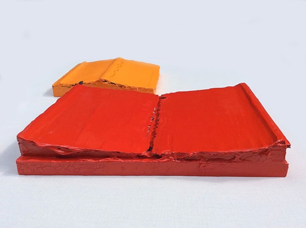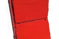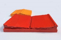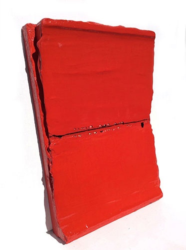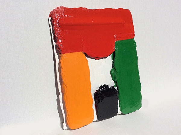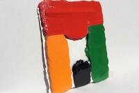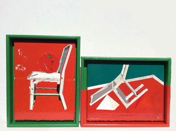 几乎与此同一时期,他还用油漆在布面上、木板上进行涂刷颜色的实验,他先用胶带在布面或木板上粘贴出一些形状,再用油漆一遍遍地上色,每上一遍,就用胶带再贴一遍边线,然后再上色再贴边线,如此反反复复,最后布面或板面上形成很厚的平面的色块,同时最为醒目的,是色块之间的边界在一次次色域分割的偏差之后留下的层层的色面,如同古树年轮剖面的一层层递进生长的痕迹,这些作品充满了材质之美,单纯、饱满的色块分割,简洁、明快,形成极简的如色域绘画一样的美学倾向,不同之处是这一切效果不是深思熟虑的结果,而是在随机的、一次次偏差涂色之后形成的,绘画成为游戏,一种最简单的一遍遍平涂的方式,同时也就取消了叙事、描绘等以往绘画惯常的手段,他的作品中反复出现的直线、矩形、方形、梯形等形状,让我想到古希腊发现和推崇的绝对美的原则,他们认为世界是由方形、圆形、三角形等一些最基本形构成的,世界万物都离不开这些最基本形的构造,它们构成了这个世界的绝对美的原则。付美军的画中亦充满了上述的基本元素,不同之处是他在一遍遍用色块平涂的过程中基本形发生了偏差,一遍又一遍的偏差,结果是这些偏差的色块如偏离航道的探测卫星一样,离原定的目标越来越远,却意外发现了新的完全陌生的星球。付美军的绘画实践即充满了这样的走向未知的探险历程,他的绘画更像是一次次的冒险行动,在每一次走向歧路的过程中,虽前途未卜却充满无尽的可能。