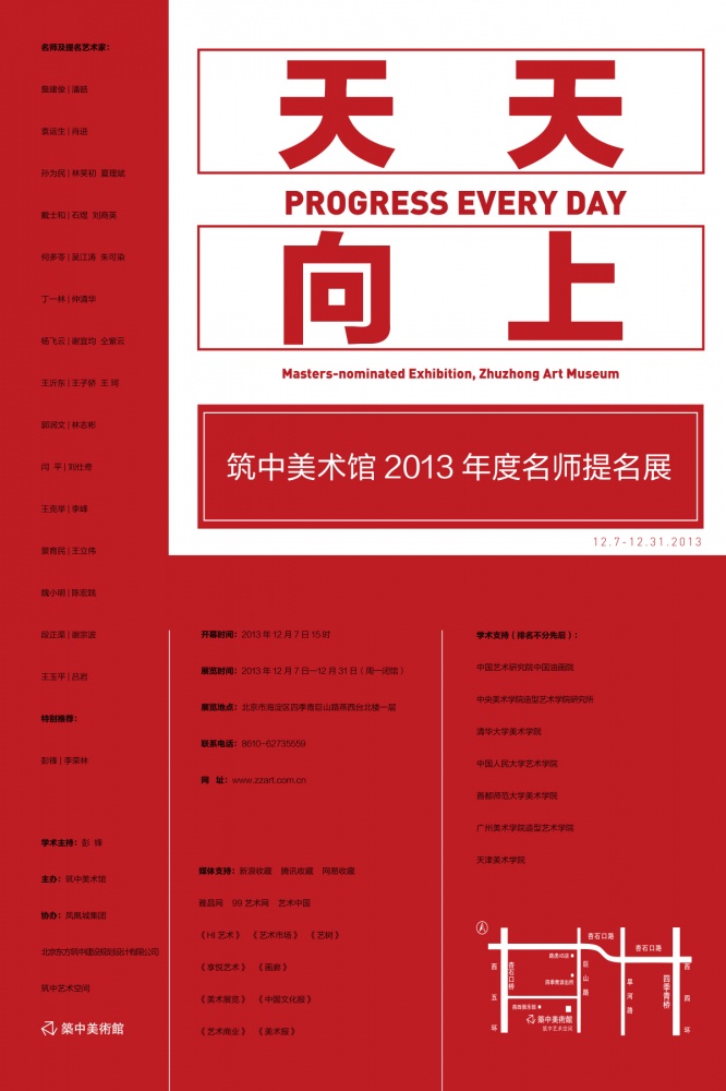 “天天向上”是筑中美术馆倾力打造的学术展览品牌,在艺术界受到广泛关注与支持,至今已举办了三届。回顾2011 年与2012年的“天天向上”,更多青年艺术家通过“名师提名”展已经逐渐崭露头角,使青年艺术家得到更多被社会关注的机会,获得更广阔的平台。筑中美术馆始终密切关注中国当代美术的发展,致力于以开阔、理性的视角挖掘富有时代性、艺术性的作品,培养当代颇具实力的青年艺术家。在今后展览中,该馆将不断推出具有艺术作品优、学术价值高的展览,为艺术家、藏家及美术爱好者搭建一个相互交流和学习的平台。