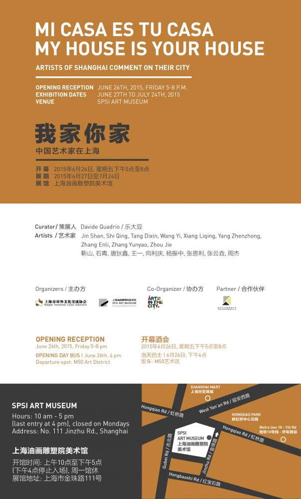 “我家你家—中国艺术家在上海”通过住在上海的艺术家的实践来进行对公共空间的探索,这些艺术家出生在不同的年代并且使用多种类型的媒介进行创作。多年以来,这些艺术家围绕上海的自然环境(或是其缺失)创作了一系列作品,“我家你家”正呈现了这些作品。这些艺术作品微妙地处于深思和幽默之间,布满在美术馆的二层。观众漫步于白色立方体空间,仿若他们在花园,一个混凝土花园亦或是非自然概念的花园。在这个空间里,艺术家们幻想着绿色冒险(石青、张恩利),与装饰玩耍(靳山、向利庆),增强光线(王一),好像在与观众们在玩一个讽刺的游戏(杨振中),或是一个诗意的游戏(张云垚、周杰)。或许他们很容易找到其他逃跑的方式,试图跳出周遭的环境,将其忽略,最终释放自己(唐狄鑫)。