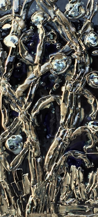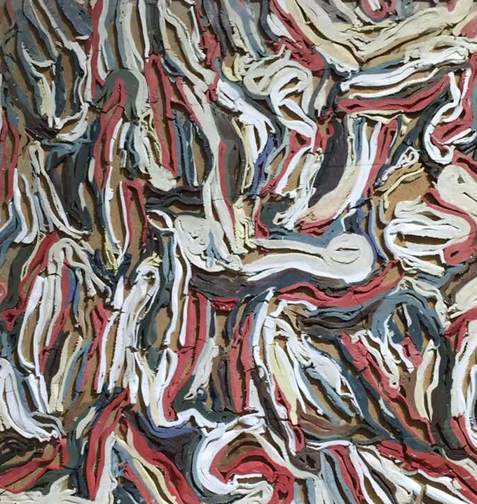“斫泥”是先将泥料排布成特定的图案,再将多余的泥料用刮刀刮掉,形成平整图案的技术。斫(同灼zhuo),意为切割。通过斫泥技术制作出来的作品除了具有平面的构成美感,还具有浮雕的质感,将泥料在空间上的可能发挥到新的高度。“绞胎”工艺兴于隋,盛于唐,宋代式微。“绞板”发展“绞胎”工艺,借不同颜色的泥料掺杂糅合,在泥板上形成色彩的融合碰撞。余乐恩将绞板技术用于平面做的创作,利用不同颜色的泥料制作成绚丽多彩的陶瓷画面。