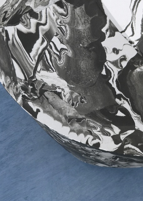 除此,作品-”亦是亦非” (2015) 融合了各种传统的雕塑形体,观众难以辨认出圆形、六角形或正方形等固有形 上概念。艺术家却认为任何形体都存有两可之说,有如世事的模棱两可,游走在两极之间。因此,这件作品是不 同的形体融合后,浑然一体的结果。这件作品的图案仿如从无垠宇宙中,俯瞰光怪陆离的地球,混沌立体的图案 与其平滑的表面产生强烈的反差,让观众处于困惑和矛盾中。《两极.共融》是一个脱离现实、偏面和主观的世 界的缩影,使人反思,只有游走于两极之间,了解世事的每一面,才能对世界作出全面的理解。由此带出作品的 中心思想,时间的本质并不是决定于分秒的流逝,而是具实验性的,决定于世界和事情之间,长久且有限的关 系。