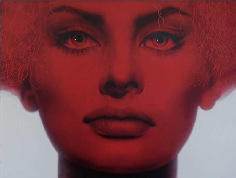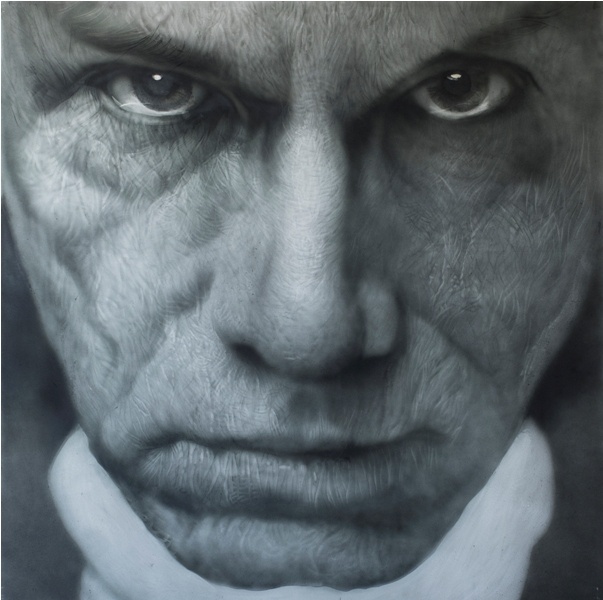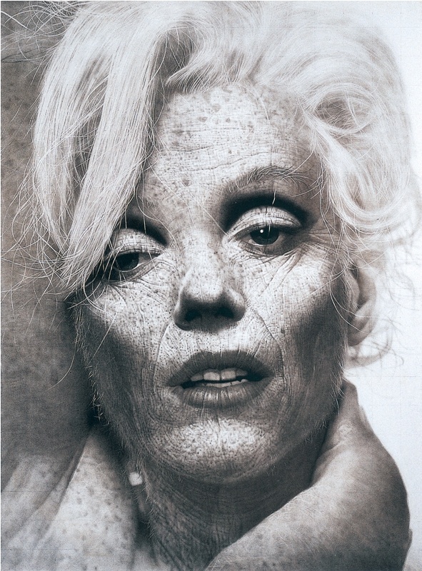 姜亨九在巨大的画布上以特写方式塑造人物的面孔。从他的作品中不难发现那些细腻写实的发丝和皱纹,还有像玛丽莲 · 梦露、奥黛丽 · 赫本、文森特 · 威廉 · 梵高、安迪 · 沃霍尔等知名人物图像,因此他的作品常被误归于“超写实主义”或是“照相写实主义”。但姜亨九并没有采用如“超写实主义”或“照相写实主义”那样将眼中的对象原样照搬到画布上的手法。比如:我们当中谁也没有见到过梦露走完一生的80岁时的样貌,在参展作品《玛丽莲 · 梦露》中所见的那满布的皱纹,松弛的皮肤和稀疏的头发,还有冷冷地直视前方的眼神,无一不是凭借姜亨九的想象去完成的。通过想象将梦露未曾存在过的老年形象画出来,可以解读成是在追忆这位命运不济的女性,亦或是对她的慰藉。就是说,姜亨九最终呈现在画布上的人物都是在他脑海中进行想象后合成的形象,艺术界将此解释成一种全新的概念——“合成写实主义”。