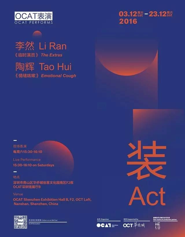 “OCAT表演”是OCAT深圳馆自2010年开始并确立的年度项目,于每年冬季举办。本年度“OCAT表演”以“装”为主题,邀请艺术家李然、陶辉参与,将于2016年12月3日至12月23日在OCAT深圳馆展厅B呈现,每周六15:30至16:10进行现场表演。两位参与艺术家为观众带来的全新创作——《临时演员》(李然)与《情绪咳嗽》(陶辉),将“声音”和“语言”作为表演的形式,通过角色的赋予以及现场空间的塑造,使观众与之产生互动,思考“现场”和“表演”的概念。