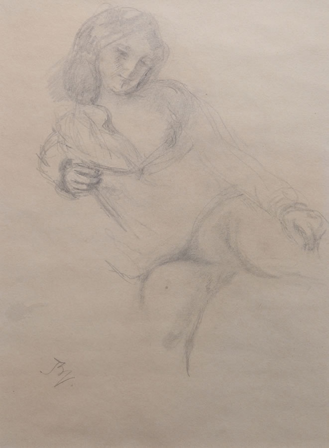 文艺复兴时期的人体素描达到一个巅峰的水准,艺术家往往学习解剖学,对人体肌肉的骨骼和肌理都非常了解。同时,他们又具有坚实的造型艺术基本功,善于用简洁的画法和明暗对比来表现出他们的这种理解。乔凡尼•阿尔伯蒂生活在1558-1601年的罗马,他这幅作品所呈现出的技法丝毫不逊于文艺复兴时期最著名的三位大师拉斐尔、达芬奇和米开朗基罗。从线条来看,这幅作品由左手画就,笔触洋溢着丰富的悲剧性情感。