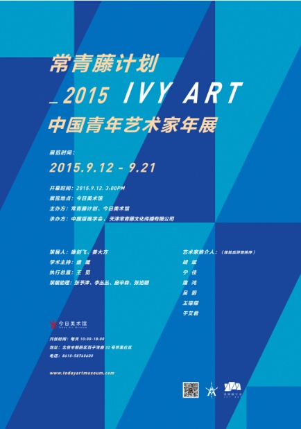 2015年9月12日至9月21日,“常青藤计划2015•中国青年艺术家年展”将于北京今日美术馆开展。展览由“常青藤计划”联手今日美术馆共同主办,中国版画学会、天津常青藤文化传播有限公司承办,由中央美院版画系教授康剑飞、“常青藤计划”项目发起人姜大方担纲策展人,《美术》杂志副主编盛葳任学术主持,特邀宁佳、胡斌、吴蔚、王檬檬、于艾君、蒲鸿等知名艺术家、批评家、媒体人士等组成强大的艺术家区域推介人团队。