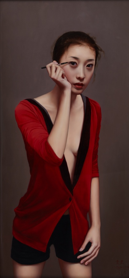 李贵君《假如一切都很完美》,李贵君,中国艺术研究院画家,师从于靳尚谊、杨飞云,第三代古典绘画的代表人物。李贵君追求质量、追求经典。作品《假如一切都很完美》画面精致,夺人眼球。画家精到的写实功力着实让观者惊叹。作品描绘了一位现代女性,穿着时下流行的衣装,手持眉笔,正在对镜梳妆。画家让时间停留在这一刻,这个凝思默想的瞬间。画中女子面对的镜子实为影射当下社会,当下社会就是她的镜子,她以当下社会为尺度来进行梳妆,带给我们很多对于当下的思考。观者面对她,又像面对镜中的自己,发人深思。画面色彩简约,衣服的黑色红色,女性的皮肤色以及背景凝重的灰色,严肃、极具冲击力,影射出画家的思想深度。在他的作品里,观者常常体会到的是一种恬静、沉寂和柔美,这样的情绪来自于少女主题传达的信息,也来自于其完美的艺术语言的和谐。