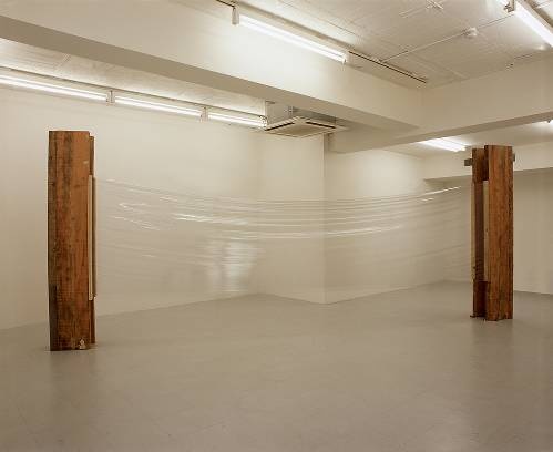 《PROTRUSION》系列制作完成于上世纪八、九十年代。初见这些作品很像平面绘画,但是艺术家通过作品的中空设计或者将矩形板粘合使其突出于画面上方等不同的创作手法,力求探索物质与周围空间的边界。比如,为2006年个展所创作的大型装置作品《空气的流路》就是由两块厚重的木桩跟中间5米多长的塑料薄膜连接而成。塑料薄膜像屏障一样将空间隔开,然而材料的柔软质感及张弛有度的线条又吸引观者走近作品,戏剧性的展示了菅木志雄艺术创作中的“空间”这一基础概念,