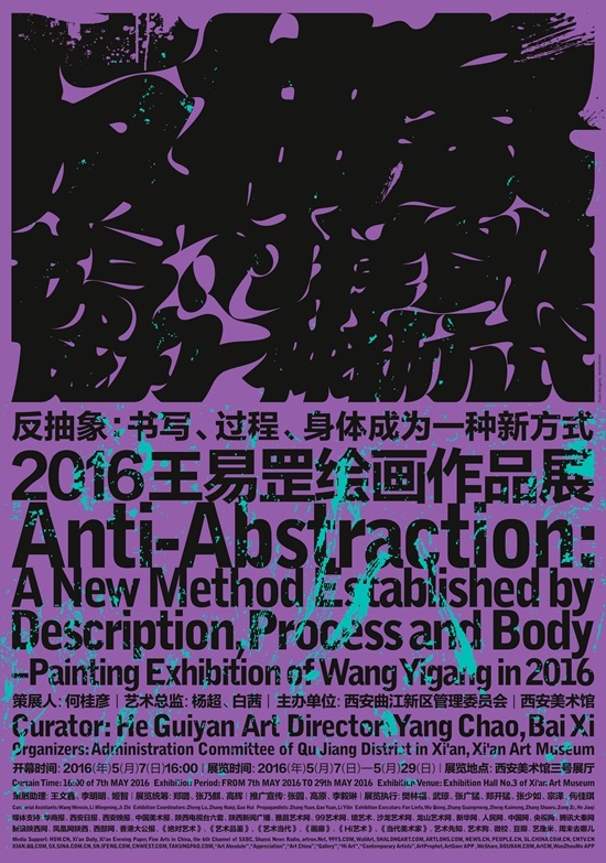2016年5月7日,由西安曲江新区管理委员会,西安美术馆主办的“反抽象:书写、过程、身体成为一种新方式——2016王易罡绘画作品展”将在西安美术馆召开,展览将持续至5月29日。展览呈现了艺术家个人在抽象领域的一种新实验,这种探索是艺术家本人绘画发展轨迹中主线的再发展,其创作同时也与中国当代绘画的上下文语境紧密相联。