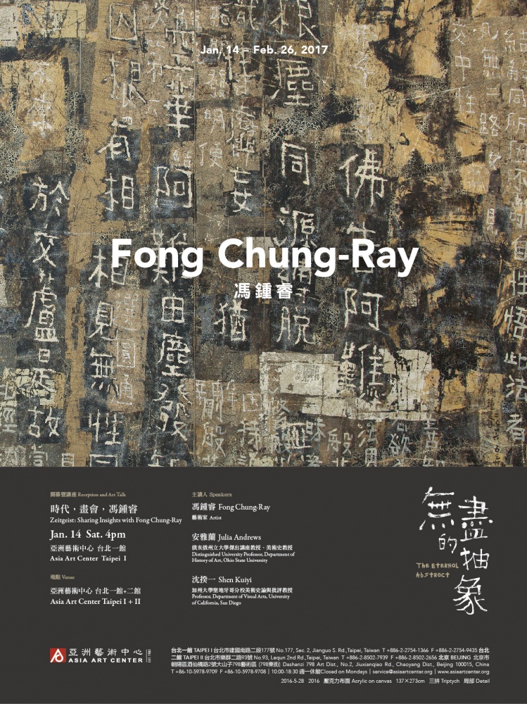 亚洲艺术中心即将于2017年1月14日举办「无尽的抽象—冯锺睿个展」。本次将于亚洲艺术中心台北一馆、台北二馆展出冯锺睿1966年至2016年的35件作品,是冯锺睿在台湾最大规模的个展。2017年1月14日(週六)开幕酒会当天下午4点,并于亚洲艺术中心台北一馆举行「时代,画会,冯锺睿」讲座,邀请沉揆一(加州大学圣地牙哥分校美术史论与批评教授)、安雅兰(俄亥俄州立大学杰出讲座教授、美术史教授)与冯锺睿对谈。展览持续至2017年2月26日。