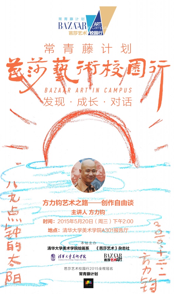 5月20日下午2点,2015“常青藤计划•芭莎艺术校园行”于清华大学美术学院启幕。艺术家方力钧,《芭莎艺术》主编孙国胜,常青藤计划发起人、天津常青藤文化传播有限公司总经理姜大方与副总常颖等嘉宾出席启动仪式。