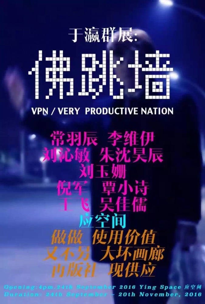 应空间将于2016年9月24日推出展览“于瀛群展:佛跳墙”。在此次展览中,于瀛选择了他长期关注的八位艺术家, 他们大多肉身翻墙到另外一个国家工作和生活,身处在不同艺术系统的差异之间,但从未远离中文互联网所搭建起来的“本土”语境。他们和中文互联网激越的“创业一代”共享同一种由新兴资本、网络管控、全球视野所构建出的网络在地经验和身份确认。