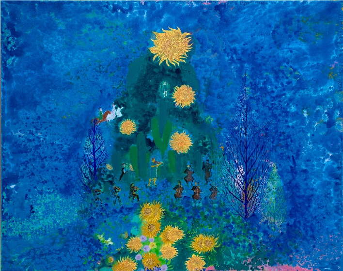 作者的代表系列作品依旧是“与自然和谐”。庭园或公园铺着新绿的草坪,那里有甜美的音乐、安息、深情的对话,描绘幸福乌托邦的系列作品。当然,纯净晴朗的深蓝色大气包围着整个画面,同时开满了光彩照人的樱桃粉色。作者的画面描绘在庭园或公园展开的幸福的庆祝场面,是超越Jean-Antoine Watteau 担忧(sans souci)的现代版Fete galante。脱离整齐的远近秩序的平面排列,似在无重力状态下漂浮的构成,充分传递了作者不做作、梦想自由的真面目。