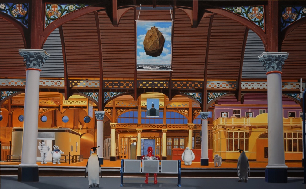 《过客》是曹文瑞本回个展的作品之一:画面前景中的钢铁人独坐在具有古典风情的车站月台,月台上的米其林娃娃、棉花糖宝宝、BAYMAX各据一方,看似毫无交集的一群虚拟角色与现实世界中的北极熊及企鹅构成一幅彷佛梦境般的画面。四个虚拟角色与三只拟人化「动物」并存的空间,充满着超现实的况味。在这个如幻似真的月台,超级英雄的角色像是人类内心欲望的投射,想要拥有与众不同的超能力,却无法以真面目示人,将真实的自我隐藏在面具与盔甲之下。画面上方的画作挪用自超现实主义画家玛格丽特之经典名作《庇里牛斯山之城》,画中飘浮的天空之城则隐喻对自由的渴望,想要一种不被约束的能力,表达出人类矛盾的心理状态。这座虚拟的月台则彷佛是人生的缩影,人们等待搭上欲望列车前往不同的目的地。乘客的旅程或长或短,有些人过得丰富精采、有些人则过得平淡乏味,然而不论过程如何,大家的终点站都是相同的,没有人例外,每个人都只是人生旅程中的过客。