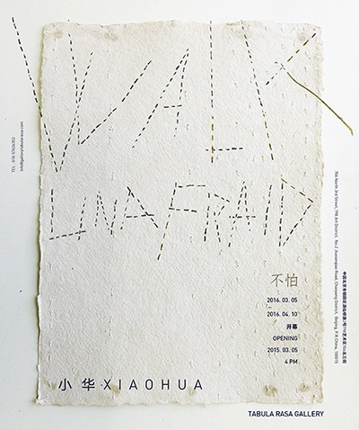 Tabula Rasa 画廊荣幸地宣布,将于2016年3月5日举办小华个展:不怕。这是艺术家在 Tabula Rasa 画廊的首次个展,展览将持续至2016年4月10日。