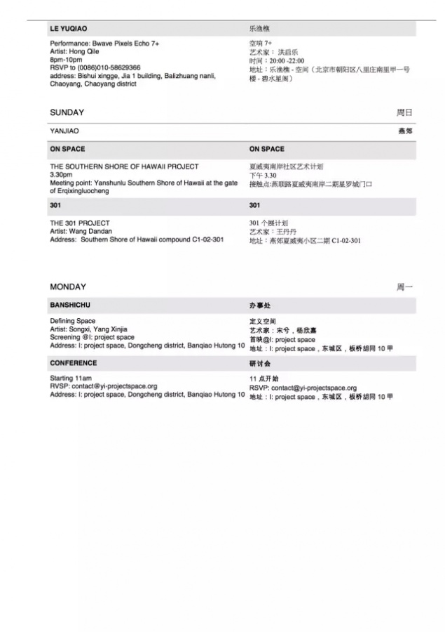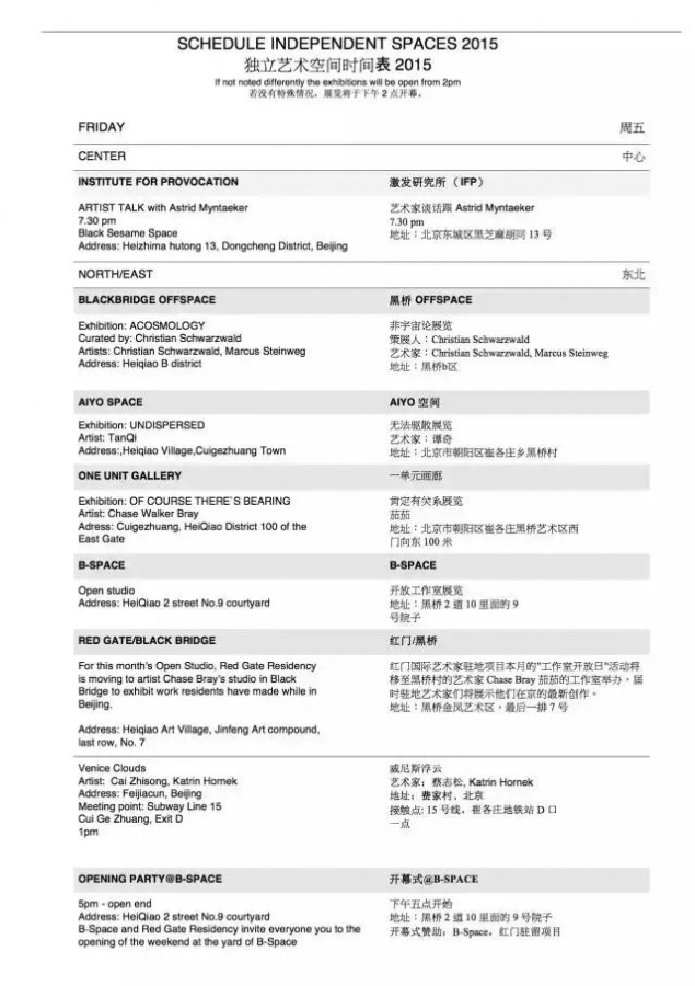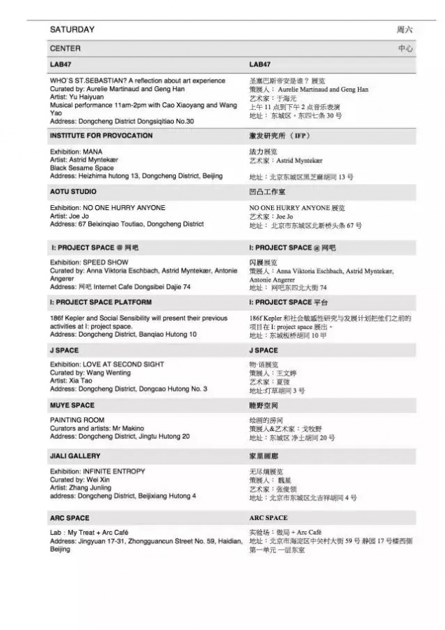 参与空间: 301, Aiyo Space, Aotu studio 凹凸空间, Arc Space, B Space, Banshichu / 办事处, Blackbridge Offspace 黑桥OFF空间, I:Project Space, Institute for Provocation 激发研究所, J Space, Jiali /家里画廊, LAB 47, LeYuQiao /乐渔樵, MUYE Space, ON SPACE, One Unit Gallery 一单元画廊, Social Sensibility 社会敏感性研究和发展计划