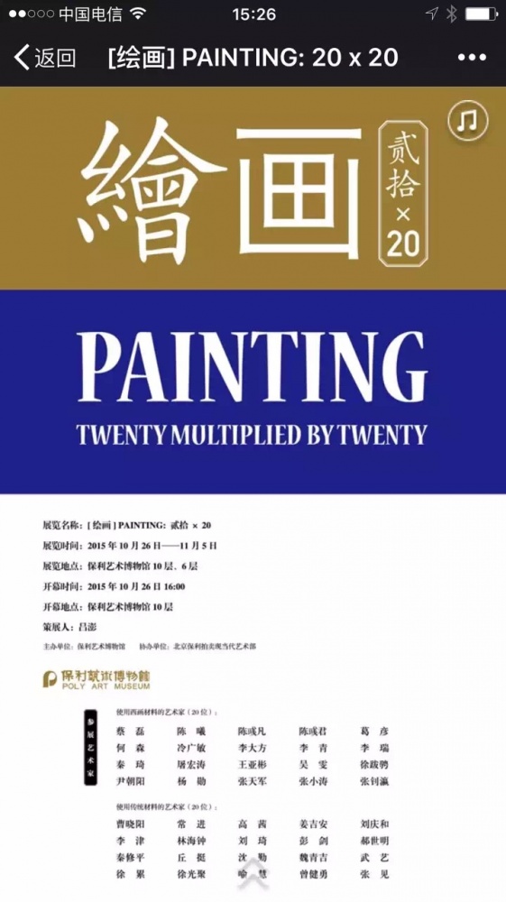 参展艺术家:蔡磊、陈曦、陈彧凡、陈彧君、葛彦、何森、冷广敏、李大方、李青、李瑞、秦琦、屠宏涛、王亚彬、吴雯、徐跋骋、尹朝阳、杨勋、张天军、张小涛、张钊瀛、曹晓阳、常进、高茜、姜吉安、刘庆和、李津、林海钟、刘琦、彭剑、郝世明、秦修平、丘挺、沈勤、魏青吉、武艺、徐累、徐光聚、喻慧、曾健勇、张见
