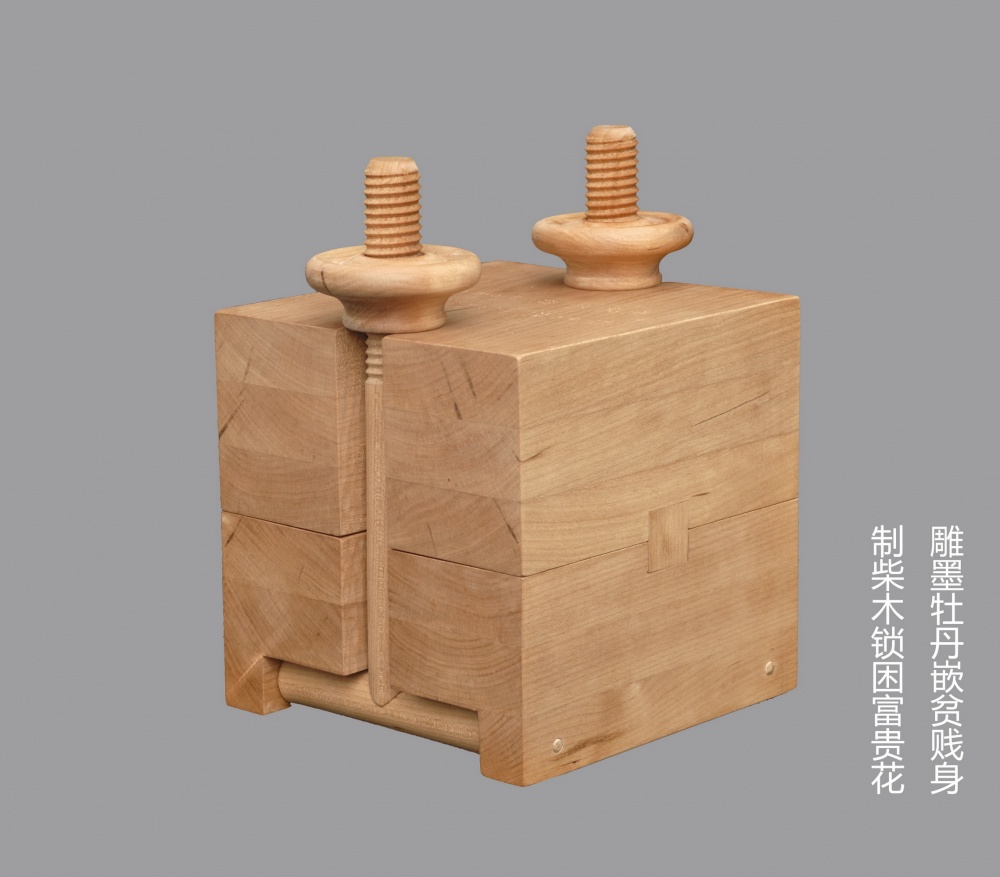 为此,彭小佳对雕塑概念做了一个小小的颠覆,恢复了传统的把玩式雕塑,也就是说他的作品不仅仅是看或某种仪式功能,而是一个过程,这个过程发生在看之前,在私下的把玩过程中进行体验,比如《铜豌豆》、《左挤右压》、《左拉右扯》、《祭祖牌•艺术真实》、《祭祖牌•真》以及《柴木锁•富贵贫贱花》等作品,尽管它们有隐喻,但这种隐喻意义只能在你手上把玩、动手操作之时才能被揭示出来。如:《柴木锁》打开后两句『雕墨牡丹嵌贫贱身 制柴木锁困富贵花』 。此外,彭小佳也积极发掘传统文化中的独特形式,采用“书”的形式和引入文字就是这方面的典型表现。比如《虚度半百》、《五十自娱》、《秋思-马致远诗意》、《没骨凹凸》、《双钩正反》、《桃花源记 》等作品都具有“书”一般的构造,可以像书一样打开、合拢,甚至翻页,而且艺术家又在作品上刻上了一些文字,这种形式实际上就是传统“书画一体”的翻版。最新的作品《山水系列》再将观众从把玩带到立体雕塑,可见,彭小佳不但在传统与现代之间找到了一个契接点,而且还试图把雕塑重新带入到生活语境之中。