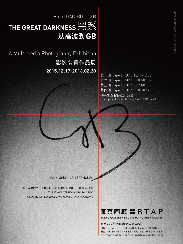 東京画廊+BTAP本年度最后一个展览《THE GREAT DARKNESS·黑系——从高波到GB 影像装置作品展》将于2015年12月17日至2016年2月28日举办。展览将分为四回展出: