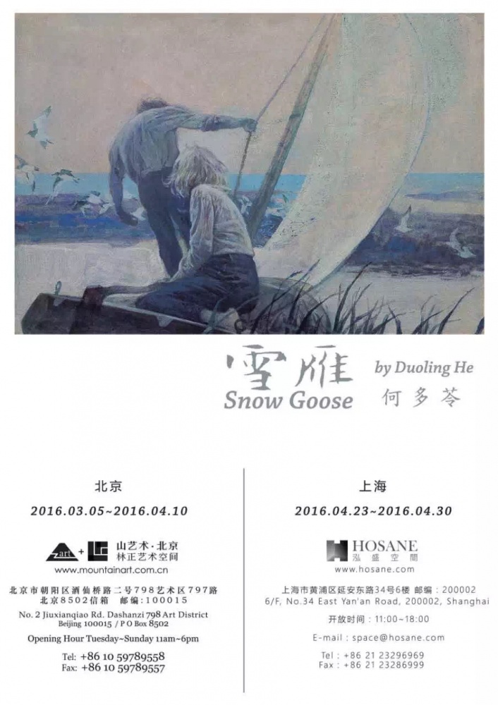 山艺术·北京林正艺术空间春节后的首个展览,是与泓盛空间共同推出的 “何多苓:雪雁”。展览将于2016年3月5日首先在798的山艺术开幕, 4月23日移步上海泓盛空间。此批作品是何多苓有感于保罗·加利科同名小说而绘制。作品形象的细腻感人、构图的独特新颖,以及意涵的丰富产生了强烈的动人效果,具有高度抒情的视觉力量。