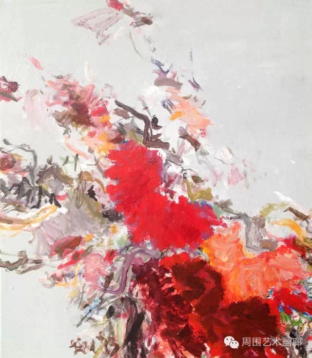 周围艺术本次群展承接一年前的主题展 《白色的十种可能》,围绕一种颜色展开叙事和讨论,让参展艺术家们用不同的形式与内容阐释自己对红色的解读与想像。参展的艺术家中,黄渊青抽象表现主义风格的笔触来自于中国书法的传承,在丰富的层次里怒放;丁蓓莉的画面敷以淡淡的红色,一改以往的微妙灰调,设色幽美绮丽;邵仄炯笔下的赤色水浪,于波涛隐隐中沿袭传统;庄颖的 《坪》 系列,依旧安静和纯粹;柴一茗和曹原铭的最新作品各自对红色元素作出更为深入的解析,梁彬彬的一件旧作——红色的鸟笼与熊在新的语境中呈现新的意趣。