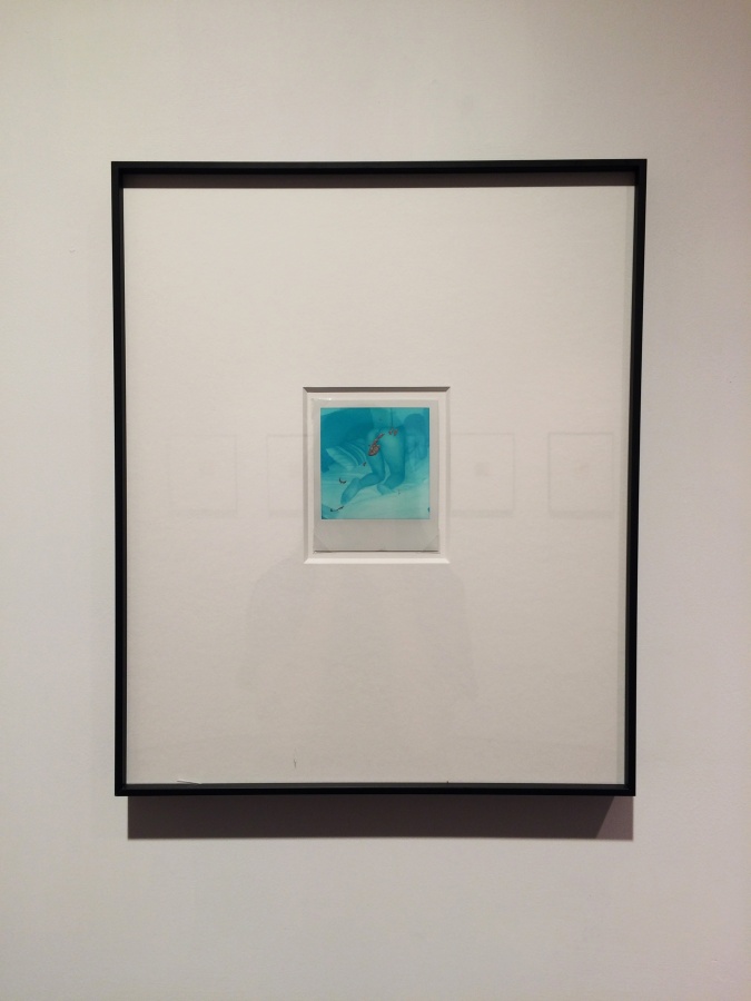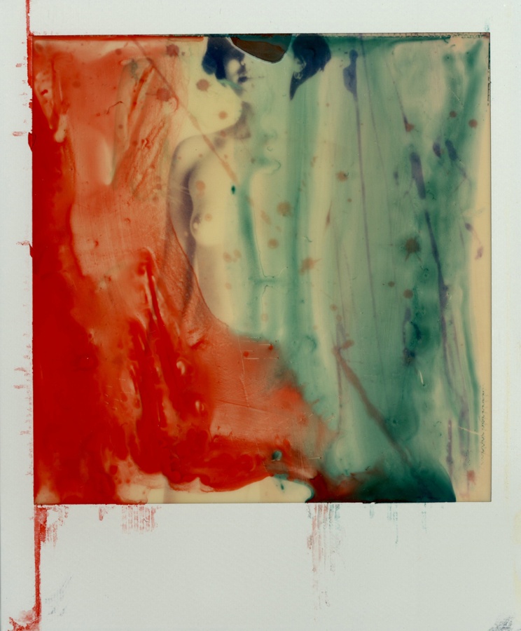 与书法同时展出的宝丽来摄影,则是绘画元素在荒木作品中的一种呈现。冲洗照片之后,荒木常会像顽皮的孩童一样用油彩在照片上肆意涂抹。比如用一笔忧郁的暗绿划过女体,或是让猩红和霉紫绽放于模特的发间,甚至有时用体液为照片打码。对于荒木经惟而言,这就是一个起死回生的过程,色彩就是复活的解药。也因此,荒木毫不犹豫地在照片上做起画来。