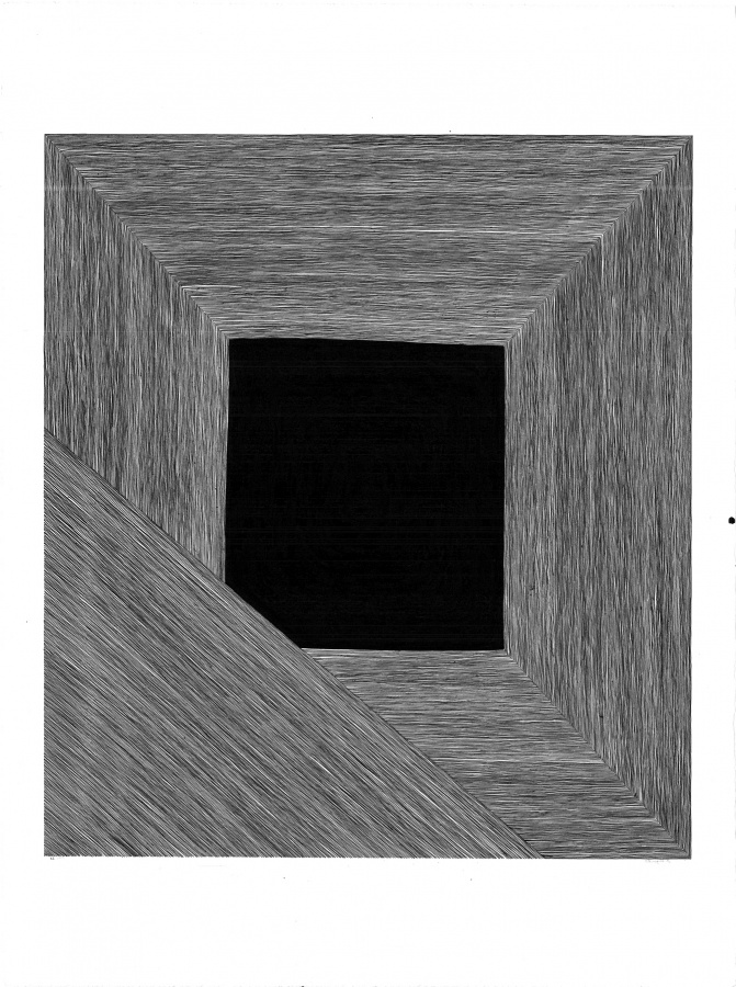 反复出现的直线与圆环的几何组合,似乎暗喻了两种文化中“刚与柔”,“循环与线性”的思维形态。无论是旧式钢笔,墨汁还是对中国木版技艺的沿袭,这些也都乎暗示了我们一个具有浓厚复古情结的艺术家形象。蘸水笔本身承载着Alena有关家庭和儿时成长的一种身体的记忆,其本身的书写方式介乎于中西之间。对于中国墨水本身的颗粒感,蘸水笔并没有“堵笔”困扰,那些不得不被间断的肌理和浓淡不匀的墨色,却是给这看似精密齐整的线条带来了生机和质感。与古老中国木版画的结合,也同样“双关”地丰满了她作品的形式和内涵。墨汁以完全不同的材料和技法被再次演绎,角色和位置被反转,线条变成了沟壑。任其随机地流淌在制版之间,图像在偶发中生成,也同样书写着作者的身体与行为,衍生出抽象且颇具当代性的意义。