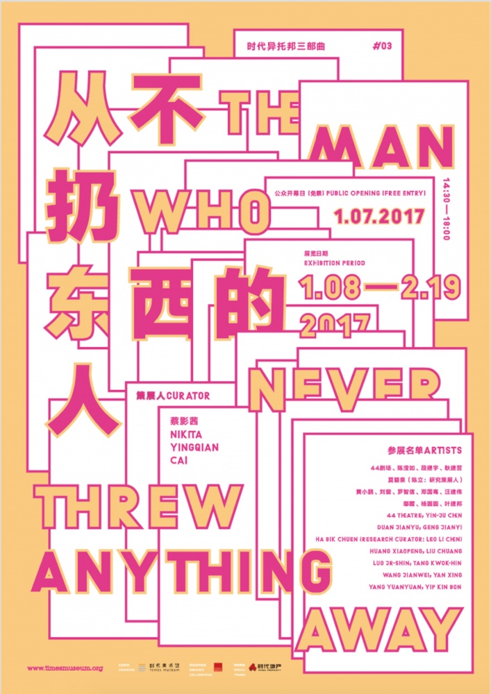 作为旧世界的收藏者和新世界的档案员,仍然以实体方式存在的美术馆对感知和知识的贡献是什么?艺术家和艺术品,能否就既存的事物和图像,提供与搜索引擎不一样的答案?“从不扔东西的人”是时代异托邦三部曲的最后一部,延续“一个(非)美术馆”(2011)和“不想点别的事情,简直就无法思考”(2014)两个项目对美术馆和机构自身的指涉,时代美术馆将探索艺术机构在当代社会复杂、多样的现实、历史和未来中,可能担当的角色。