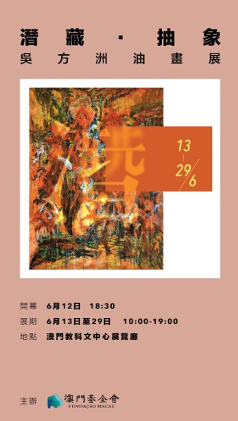 由澳门基金会主办之澳门艺术家推广计划:“潜藏.抽象——吴方洲油画展”,将于2015年6月12日(星期五)下午6时30分在澳门教科文中心展览厅揭幕,届时将展出澳门艺术家吴方洲先生自1992年至今的抽象绘画作品50余幅。展览分四个系列,包括【往事:移动的风景】【超欲感】【潜藏】【寻找十字架】,是作者探索抽象绘画心路历程的真实纪录,同场并首发《潜藏.抽象——吴方洲油画集》。