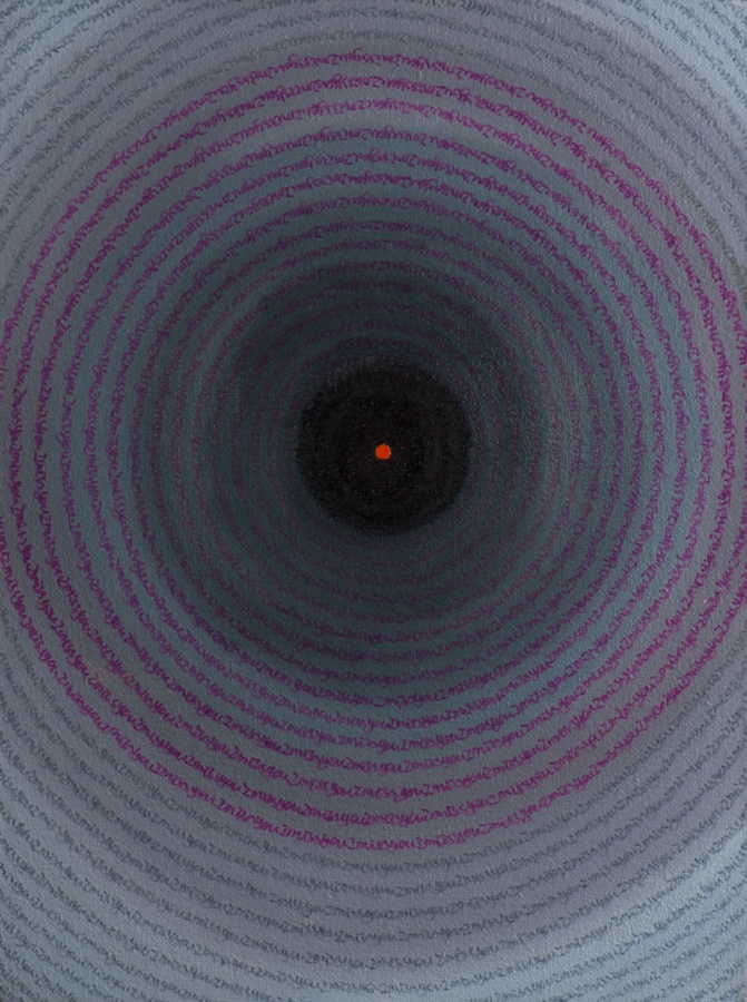 令我印象深刻的一个作品是她用金色笔触写满I MISS YOU,色彩渐变,针脚般细密,一圈又一圈,犹如水之涟漪,由深至浅,渐次荡漾开来,犹如心花之绽放,犹如少女之怀春。无一例外,仍旧是剑和闪电,刺人眼目,完全破开画面,劈开一个看似圆满的“我”。