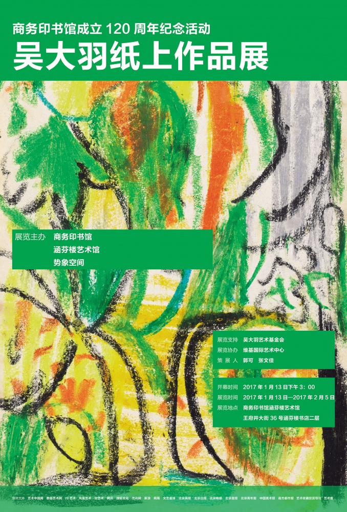 为庆祝商务印书馆创办120周年,由商务印书馆、涵芬楼艺术馆、势象空间联合主办,维基国际艺术中心协办,吴大羽艺术基金会支持的“商务印书馆成立120周年纪念活动——吴大羽纸上作品展”将于2017年1月13日下午在涵芬楼艺术馆开幕。