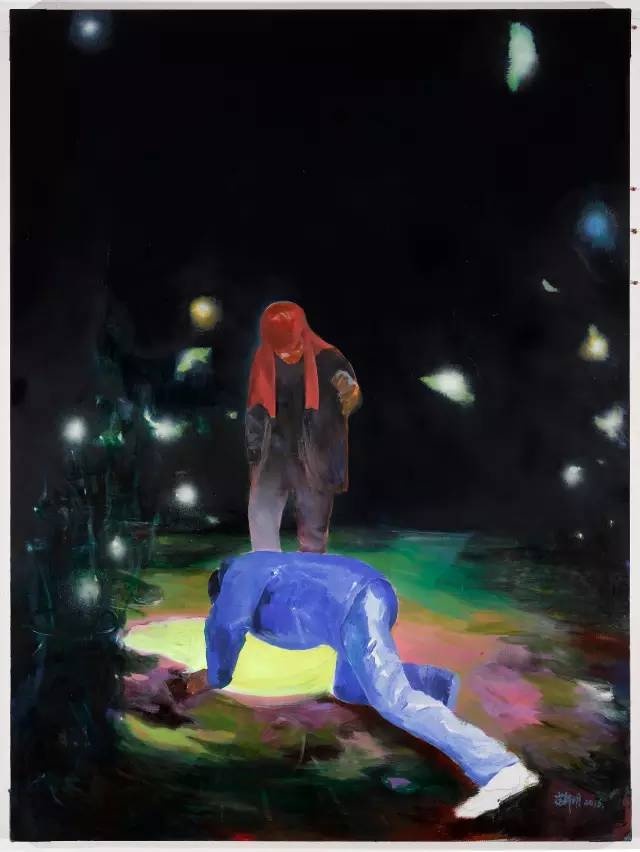 崔新明的绘画总是源自四季分明的北方和对故乡的回望。处于遗忘角落的中国二三线乡镇城市被时代的余波扭拧成奇异的场景,出现在艺术家对故里的远观和一次次牵引式的回溯时所产生的巨大落差之中,其中的晕眩感促成了作品中的光怪陆离。《节日》系列从崔新明回乡记录的画面展开:故人、仪式、庆典置于空荡落寞的背景上,植物、房子的体量远大于人类的生活痕迹,贯穿在画面中的荧光绿色和光斑渲染着节日气氛,也暗指着艺术家对于瞬间荣耀和光明的警觉。首次出现的自画像回应着近年的沉淀和自省。