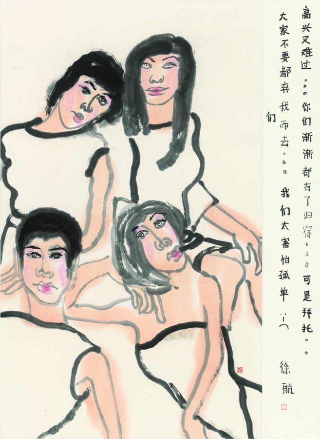徐航是具有代表性的新一代中国青年水墨艺术家。这位出生在70年代的艺术家不仅用自己的身心感受着这个时代的变化,参与着这个社会翻天覆地的变革,也在用他的笔墨记录着、表现着自己所处的这个时代。近些年他关注的主要对象是移动互联网背景下现代都市人群的生活百态:屌丝女、欧巴、大叔、小鲜肉、女神、美眉……他认为他们身上强烈呈现着社会的表情、色彩、语言、空气、甚至是这些人的声音、思想、状态,最为真实,他们直接代表着组成这个社会的因子。
