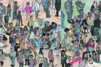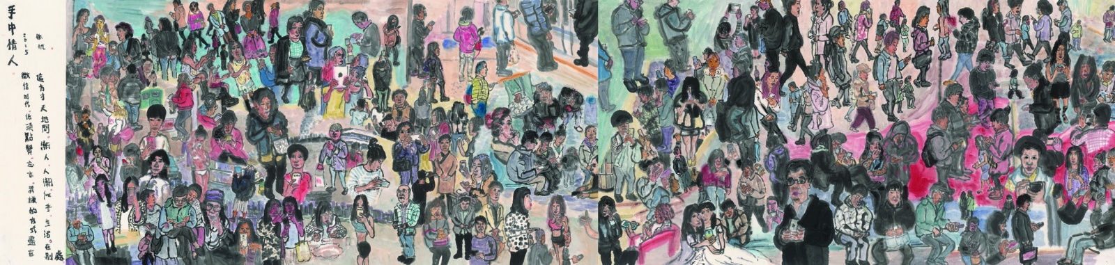 徐航大幅面的水墨画面上充满了各种青年男女的影像,通常是中国城市的青年人物。