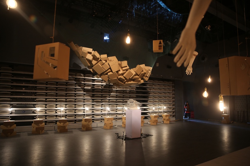 著名建筑设计师路易斯.康的作品多以光影见长,他本人的情感经历亦颇为跌宕,而这些都给了导演苏丹极大的创作激情和许多灵感。本次作品大量使用不同种类的甜品食材和废弃的包装盒、餐具作为舞美道具,结合光影打造出与现实视角截然不同的舞台视觉效果。甜品一直是苏丹作品中每次必会出现的元素,不同种类的甜品暗示不同感觉的爱情,或浓重,或淡雅; 选择甜品的包装来做光影投射的参照物,以此表现包裹爱情的糖衣-投射出的影子则表现激情褪去后的关系本质。导演利用17种不同种类,共计1223个甜品的包装,制作此作品舞美装置以及灯光效果,配合悬挂装置,另光影自然旋转,营造出人在幼儿时躺在婴儿车中看到天花板上的旋转玩具所投射出的光影的梦幻效果,带领观剧者走入最本真、原始的情感世界,还原一切刚开始的样子。