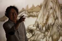 徐冰一直通过自己的艺术在寻找如何激活中国传统文化核心的方法。《背后的故事》是他自2004年开始创作的系列作品,艺术家由植物在磨砂玻璃上投下的影子获得灵感,创作了介于“是”与“不是”之间的山水画。从正面看,展现在观众眼前的是一幅惟妙惟肖的中国山水画,但转向作品的背面,就会发现这幅山水画是通过对光的调配,用干枯植物、麻丝等看似平常的现成物构成的。艺术家称之为“光的绘画”。