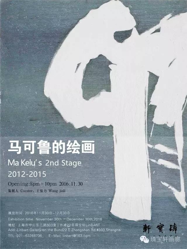 2016年11月30日,外滩22号璘宝轩画廊隆重推出“马可鲁的绘画” 阶段时期二(2012-2015),这是马可鲁绘画阶段一展览的延续,第一阶段展示了马可鲁70年代“无名画会”时期的风景作品,以及一批洋溢强烈情感色彩的早期抽象代表作。在第二阶段主要展现马可鲁于2012-2015年的创作,作品形式较之早期绘画,更倾于主观化、纯粹化,从内容到理念均呈现出新的面貌和风格。