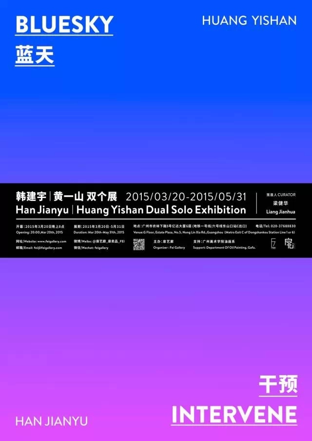 广州扉艺廊将于本季隆重推出两位年青艺术家韩建宇、黄一山双个展“干预/蓝天”,这是两位工作生活于广州的艺术家首次在本土举办个展,此展览定于3月20日开幕,持续至5月31日。本次展出的是两位艺术家于二零一四至二零一五年间创作的最新作品,这些作品可以说是他们对此前相对稳定的工作方式的延展和挑战。