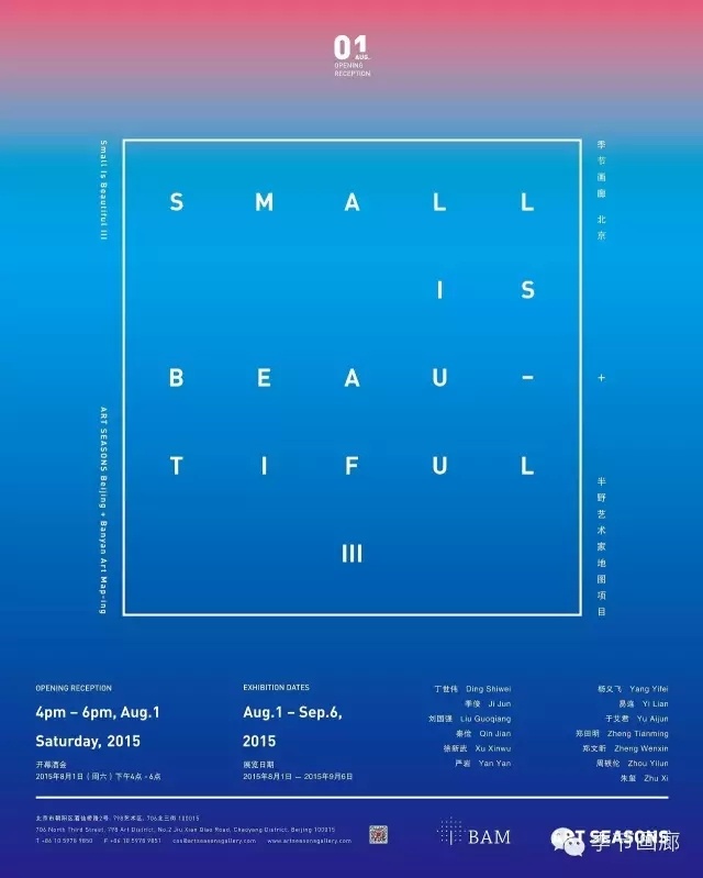 “小”,作为一种日常修辞,常会使被描述的对象体现出亲切的、随和的魅力。在这个时代,庞大的信息量无休止地挑战和挤压着我们的神经,艺术作为时代精神最敏锐的表征,同样呈现出纷杂的面貌和样态。Small Is Beautiful 是季节画廊2013年开启的一个年度群展项目,意在从(当代)展览的能指出发,以“小”的形制探讨问题承载和艺术多义的可能性,力图以此角度应答或对峙当代艺术的“大"的权力话语,以自由轻松之态度、以四两之勇气力拨千斤之钧,唯此,“小”才有它的意义。