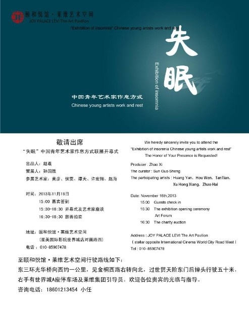 2013年11月26日,由北京颐和悦馆•莱维艺术空间举办的“失眠——青年艺术家作息方式”展览将隆重开幕。本次展览由知名艺术媒体人、策展人孙国胜担任策展人,邀请了侯雯、黄彦、谭天、许宏翔、赵海五位艺术家参与。他们分别用装置、雕塑及绘画等多种艺术方式来展现常常在“熬夜”与“失眠”状态下的创作。颐和悦馆•莱维艺术空间作为北京CBD唯一一家高端艺术生活馆,将持续的关注精英人群的生活方式,试图用艺术完善人们的生活。