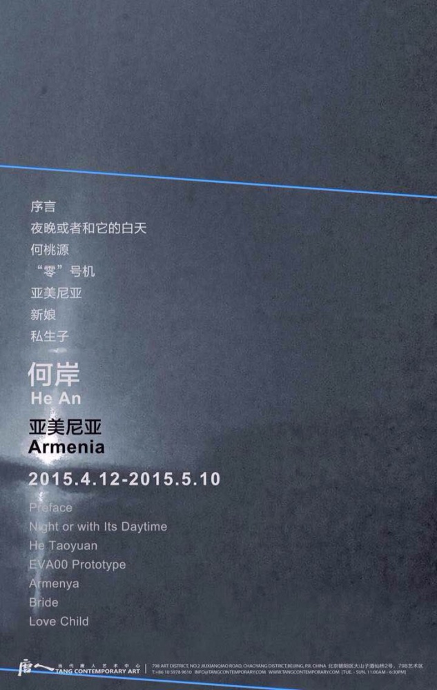 何岸把展览的七件作品分别命名为“序言 - 夜晚或者和它的白天 - 何桃源 -‘零’号机 - 亚美尼亚 - 新娘 - 私生子”,每一个词语本身失去所指,能指之间的相互勾连形成另外一种它者的叙述,作为修辞手法共同形成一部虚构的小说或戏剧。虚构和现实并行相互刺激玩弄和挤压,获得同样的张力,同样的在场。何岸用文字与修辞、修辞与时间、时间与传说之间的关系搭建出一个魔幻现实平面的世界,一种新的可能性的语言在此展开。