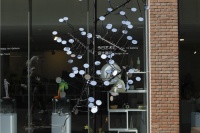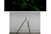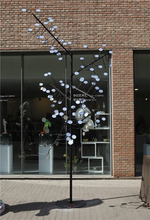 欧阳苏龙的作品《借光》分成两个部分,“空的橱窗”和“夜里的彩虹”。一部分是在橱窗斜对面的树形反光装置,随时间不断变化。通过调试各个分支上的镜面,反射阳光。随太阳朝升西落,在橱窗内投射出的光圈组合一直不断变化。第二部分是由橱窗内的人造光源出发,在对面的砖墙上映上一道“彩虹”。展览期间,美术馆的2号橱窗就像“空”的一样。