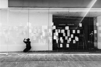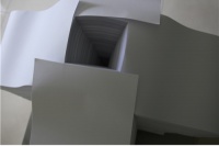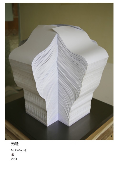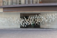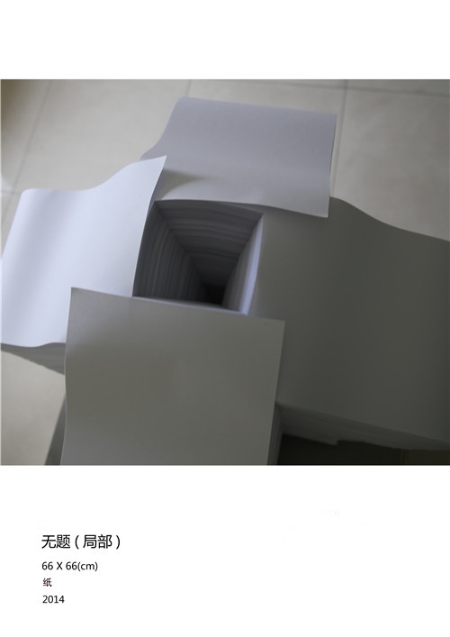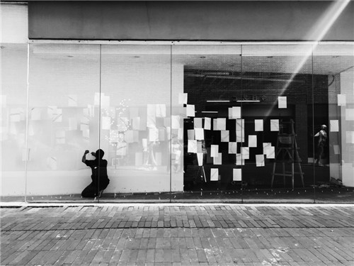 谢玮的作品《感知的碎片》将橱窗由外向内分为10层,每一层分布着不同数量、位置和图案的宣纸。从远处看来是一个错落有致的整体。这个感性的空间装置的制作过程十分理性。经过前期严密的计算、严谨的设计和严格的布置才得以最终呈现。