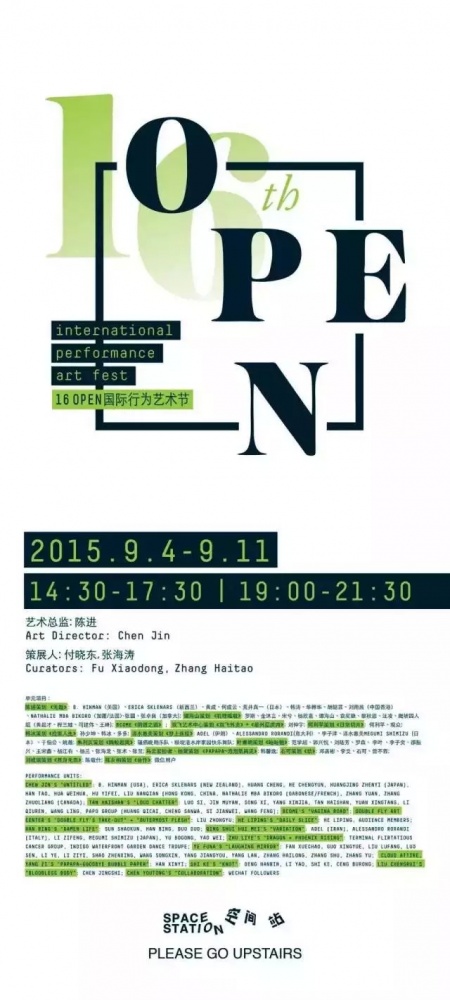 “OPEN 打开国际行为艺术节”是在中国的第一个也是规模最大的历史最长的一个非官方的民间国际行为艺术节,创始于2000年,设计为每年一届,旨在中国建立“自由的国际行为艺术平台”。第十六届“OPEN打开国际艺术节”艺术总监陈进,邀请张海涛、付晓东作为本届艺术节的策展人,今年艺术节侧重研究行为艺术“跨界与合作”的可能性,将于9月4日一11日在798艺术区空间站举办。