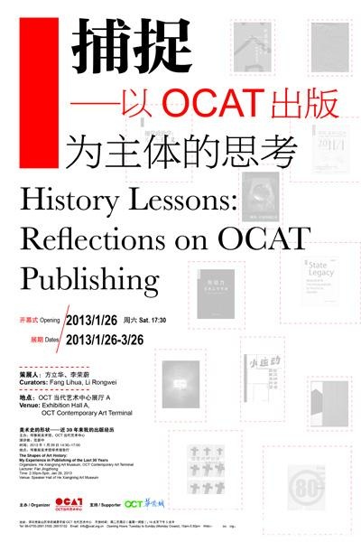 “捕捉——以OCAT出版为主体的思考”是一项以OCAT出版为主体的讨论专案,由OCAT年轻策展人方立华与李荣蔚共同策划、OCAT展览和外联部共同参与组织。该项目一方面对OCAT自2005年成立以来所编辑的系列出版物进行梳理和讨论,重新呈现、观看和思考我们的出版物和出版工作,另一方面,进一步思考和探讨出版物与展览、研讨会之间的关系,包括讨论出版物本身所涉及的当代艺术作品与研究、写作、翻译和史料之间的关系问题。从整个艺术系统的角度出发,重新观看和讨论知识生产,冀望借此讨论激发艺术工作者同仁对于当代艺术的出版工作的反思性思考。